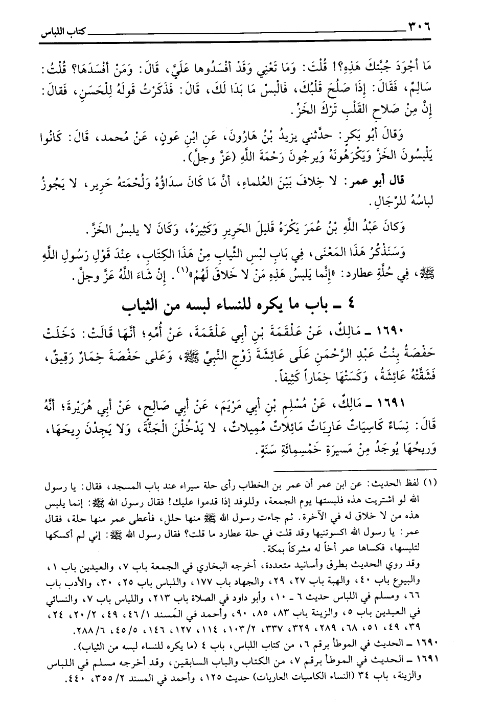 وَكَانَ عَبْدُ اللَّهِ بْنُ عُمَرَ يَكْرَهُ قَلِيلَ الْحَرِيرِ وَكَثِيرَهُ وَكَانَ لَا يَلْبَسُ الْخَزَّ