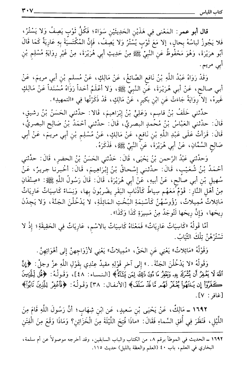 قَالَ أَبُو عُمَرَ الْمَعْنَى فِي هَذَيْنِ الْحَدِيثَيْنِ سَوَاءٌ فَكُلُّ ثَوْبٍ يَصِفُ وَلَا يَسْتُرُ فَلَا يَجُوزُ لِبَاسُهُ بِحَالٍ إِلَّا مَعَ ثَوْبٍ يَسْتُرُ وَلَا يَصِفُ فَإِنَّ الْمُكْتَسِيَةَ بِهِ عَارِيَةٌ كَمَا قَالَ أَبُو هُرَيْرَةَ وَهُوَ مَحْفُوظٌ عَنِ النَّبِيِّ صَلَّى اللَّهُ عَلَيْهِ وَسَلَّمَ مِنْ حَدِيثِ أَبِي هُرَيْرَةَ مِنْ غَيْرِ رِوَايَةِ مُسْلِمِ بْنِ أَبِي مَرْيَمَ