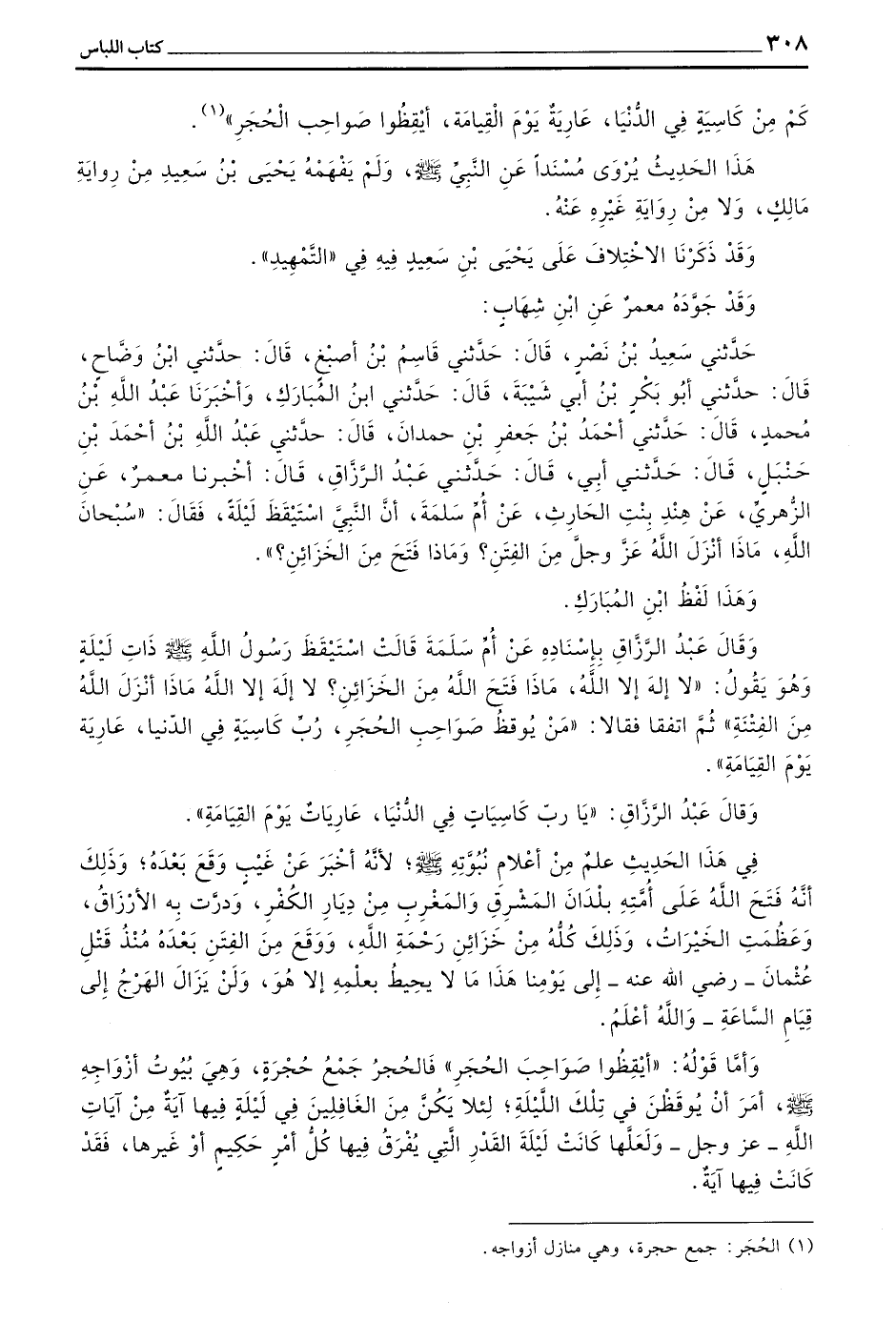 حَدَّثَنِي سَعِيدُ بْنُ نَصْرٍ قَالَ حَدَّثَنِي قاسم بن أصبغ قال حدثني بْنُ وَضَّاحٍ قَالَ حَدَّثَنِي أَبُو بَكْرِ بْنُ أبي شيبة قال حدثني بن الْمُبَارَكِ وَأَخْبَرَنَا عَبْدُ اللَّهِ بْنُ مُحَمَّدٍ قَالَ حَدَّثَنِي أَحْمَدُ بن جعفر بن حمدان قَالَ حَدَّثَنِي عَبْدُ اللَّهِ بْنُ أَحْمَدَ بْنِ حَنْبَلٍ قَالَ حَدَّثَنِي أَبِي قَالَ حَدَّثَنِي عَبْدُ الرَّزَّاقِ قَالَ أَخْبَرَنَا مَعْمَرٌ عَنِ الزُّهْرِيِّ عَنْ هِنْدِ بِنْتِ الْحَارِثِ عَنْ أُمِّ سَلَمَةَ أَنَّ النَّبِيَّ اسْتَيْقَظَ لَيْلَةً فَقَالَ سُبْحَانَ اللَّهِ مَاذَا أَنْزَلَ اللَّهُ عَزَّ وَجَلَّ مِنَ الْفِتَنِ وَمَاذَا فَتَحَ من الخزائن