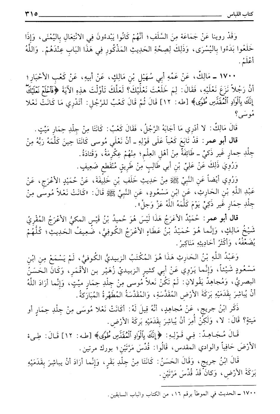 1700 - مَالِكٌ عَنْ عَمِّهِ أَبِي سُهَيْلِ بْنِ مَالِكٍ عَنْ أَبِيهِ عَنْ كَعْبِ الْأَحْبَارِ أَنَّ رَجُلًا نَزَعَ نَعْلَيْهِ فَقَالَ لِمَ خَلَعْتَ نَعْلَيْكَ لَعَلَّكَ تَأَوَّلْتَ هَذِهِ الْآيَةَ (فَاخْلَعْ نعليك إنك بالواد الْمُقَدَّسِ طُوًى) طه 12 قَالَ ثُمَّ قَالَ كَعْبٌ لِلرَّجُلِ أَتَدْرِي مَا كَانَتْ نَعْلَا مُوسَى قَالَ مَالِكٌ لَا أَدْرِي مَا أَجَابَهُ الرَّجُلُ فَقَالَ كَعْبٌ كَانَتَا مِنْ جِلْدِ حِمَارٍ مَيِّتٍ
