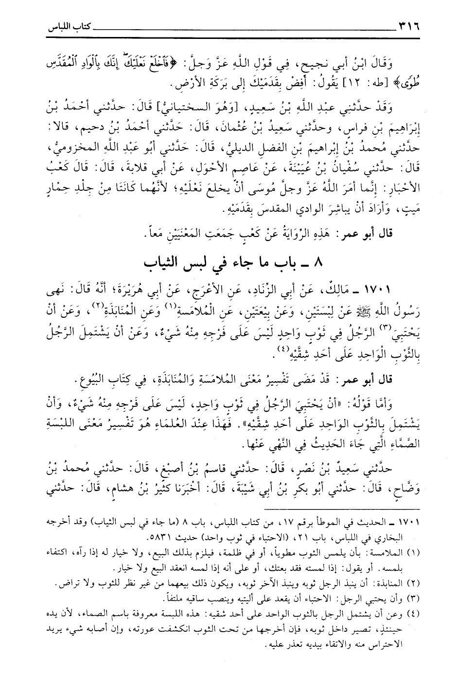 1701 - مَالِكٌ عَنْ أَبِي الزِّنَادِ عَنِ الْأَعْرَجِ عَنْ أَبِي هُرَيْرَةَ أَنَّهُ قَالَ نَهَى رَسُولُ اللَّهِ صَلَّى اللَّهُ عَلَيْهِ وَسَلَّمَ عَنْ لُبْسَتَيْنِ وَعَنْ بَيْعَتَيْنِ عَنِ الْمُلَامَسَةِ وَعَنِ الْمُنَابَذَةِ وَعَنْ أَنْ يَحْتَبِيَ الرَّجُلُ فِي ثَوْبٍ وَاحِدٍ لَيْسَ عَلَى فَرْجِهِ مِنْهُ شَيْءٌ وَعَنْ أَنْ يَشْتَمِلَ الرَّجُلُ بِالثَّوْبِ الْوَاحِدِ عَلَى أَحَدِ شِقَّيْهِ