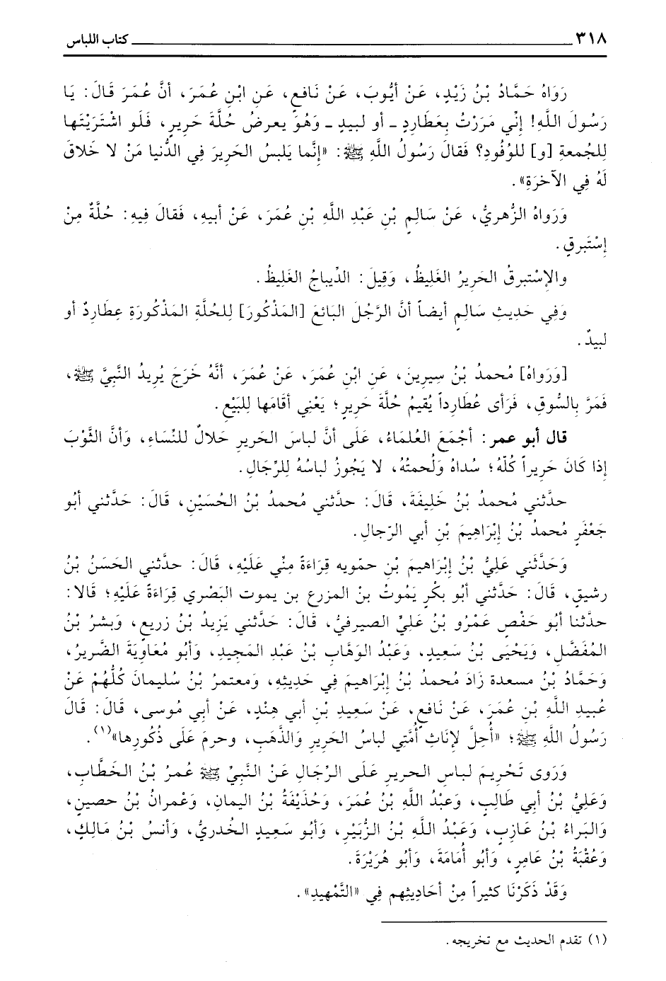 وَرَوَى تَحْرِيمَ لِبَاسِ الْحَرِيرِ عَلَى الرِّجَالِ عَنِ النَّبِيِّ صَلَّى اللَّهُ عَلَيْهِ وَسَلَّمَ عُمَرَ بْنِ الْخَطَّابِ وَعَلِيِّ بْنِ أَبِي طَالِبٍ وَعَبْدُ اللَّهِ بْنُ عُمَرَ وَحُذَيْفَةُ بْنُ الْيَمَانِ وَعِمْرَانُ بْنُ حُصَيْنٍ وَالْبَرَاءُ بْنُ عَازِبٍ وَعَبْدُ اللَّهِ بْنُ الزُّبَيْرِ وَأَبُو سَعِيدٍ الْخُدْرِيُّ وَأَنَسُ بْنُ مَالِكٍ وَعُقْبَةُ بْنُ عَامِرٍ وَأَبُو أُمَامَةَ وَأَبُو هُرَيْرَةَ