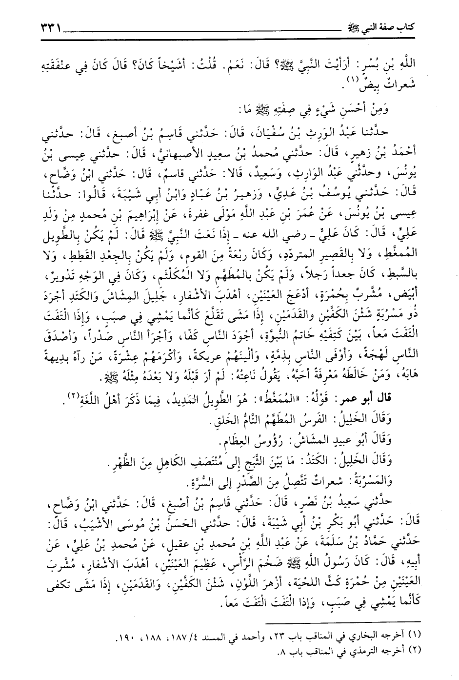حَدَّثَنِي سَعِيدُ بن نصر قال حدثني قاسم بن أصبغ قال حدثني بْنُ وَضَّاحٍ قَالَ حَدَّثَنِي أَبُو بَكْرِ بْنُ أَبِي شَيْبَةَ قَالَ حَدَّثَنِي الْحَسَنُ بْنُ مُوسَى الأشيب قال حدثني حَمَّادُ بْنُ سَلَمَةَ عَنْ عَبْدِ اللَّهِ بْنِ مُحَمَّدِ بْنِ عَقِيلٍ عَنْ مُحَمَّدِ بْنِ عَلِيٍّ عَنْ أَبِيهِ قَالَ كَانَ رَسُولُ اللَّهِ صَلَّى اللَّهُ عَلَيْهِ وَسَلَّمَ ضَخْمَ الرَّأْسِ عَظِيمَ الْعَيْنَيْنِ أَهْدَبَ الْأَشْفَارِ مُشَرَّبَ الْعَيْنَيْنِ مِنْ حُمْرَةٍ كَثَّ اللِّحْيَةِ أَزْهَرَ اللَّوْنِ شَثْنَ الكفين والقدمين إذا مشى تكفى كَأَنَّمَا يَمْشِي فِي صَبَبٍ وَإِذَا الْتَفَتَ الْتَفَتَ معا