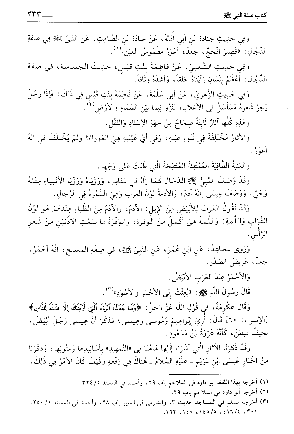 وَقَدْ وَصَفَ النَّبِيُّ صَلَّى اللَّهُ عَلَيْهِ وَسَلَّمَ الدَّجَّالَ كَمَا رَآهُ فِي مَنَامِهِ وَرُؤْيَاهُ وَرُؤْيَا الْأَنْبِيَاءِ مِثْلُهُ وَحْيٌ وَوَصَفَ عِيسَى بِأَنَّهُ آدَمُ وَالْأُدْمَةُ لَوْنُ الْعَرَبِ وَهِيَ السُّمْرَةُ فِي الرِّجَالِ