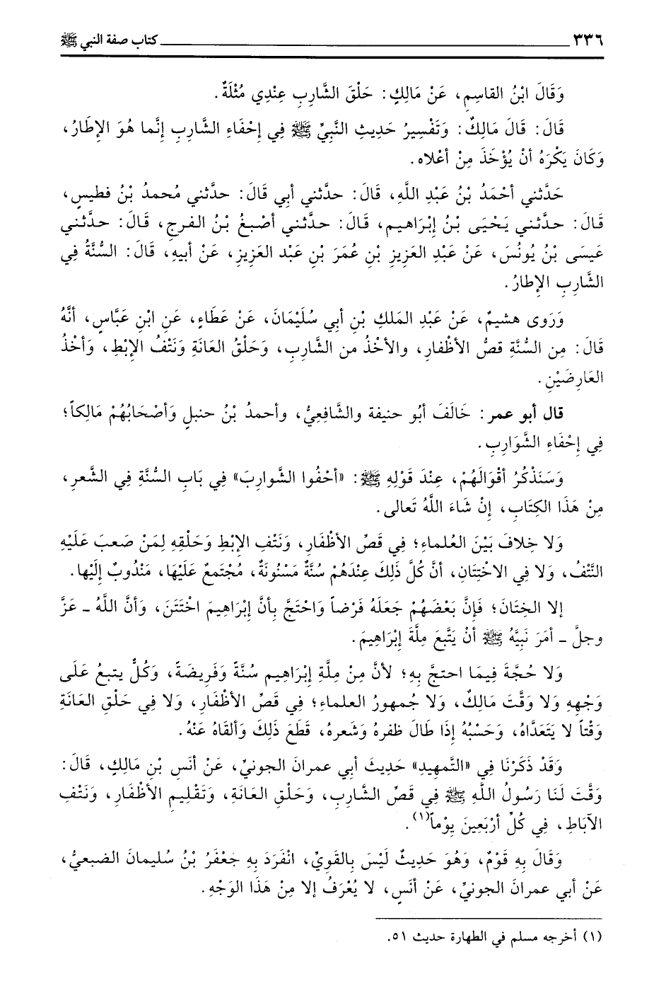 قَالَ أَبُو عُمَرَ خَالَفَ أَبُو حَنِيفَةَ وَالشَّافِعِيُّ وَأَحْمَدُ بْنُ حَنْبَلٍ وَأَصْحَابُهُمْ مَالِكًا فِي إِحْفَاءِ الشَّوَارِبِ