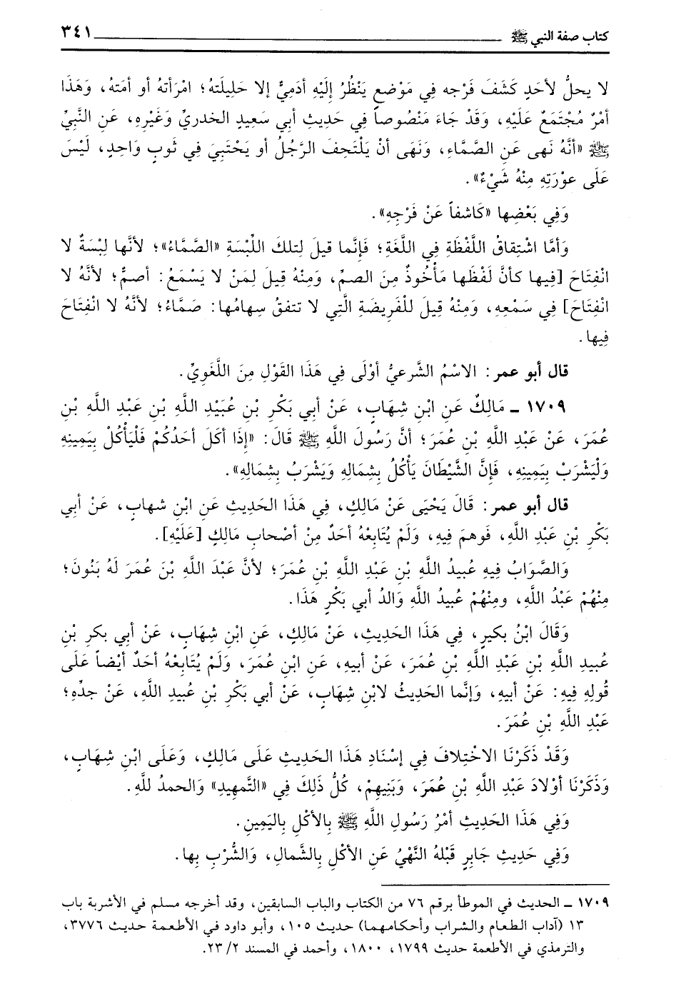 1709 - مَالِكٌ عن بن شِهَابٍ عَنْ أَبِي بَكْرِ بْنِ عُبَيْدُ اللَّهِ بْنُ عَبْدِ اللَّهِ بْنِ عُمَرَ عَنْ عَبْدِ اللَّهِ بْنِ عُمَرَ أَنَّ رَسُولَ اللَّهِ صَلَّى اللَّهُ عَلَيْهِ وَسَلَّمَ قَالَ إِذَا أَكَلَ أَحَدُكُمْ فَلْيَأْكُلْ بِيَمِينِهِ وَلْيَشْرَبْ بِيَمِينِهِ فَإِنَّ الشَّيْطَانَ يَأْكُلُ بِشِمَالِهِ وَيَشْرَبُ بِشِمَالِهِ