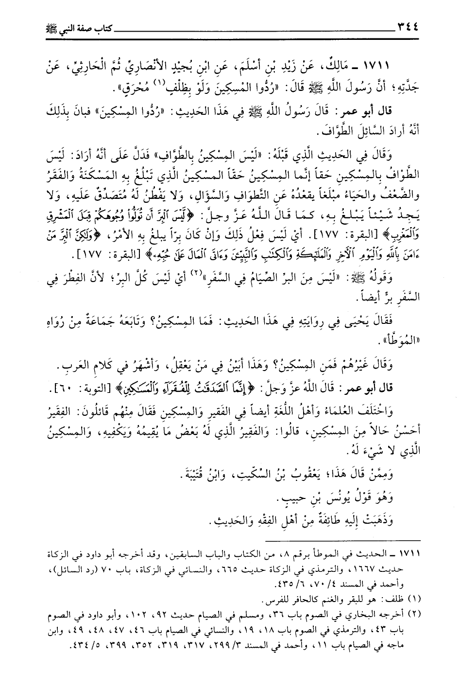 قَالَ أَبُو عُمَرَ قَالَ رَسُولُ اللَّهِ صَلَّى اللَّهُ عَلَيْهِ وَسَلَّمَ فِي هَذَا الْحَدِيثِ رُدُّوا الْمِسْكِينَ فَبَانَ بِذَلِكَ أَنَّهُ أَرَادَ السَّائِلَ الطَّوَّافَ