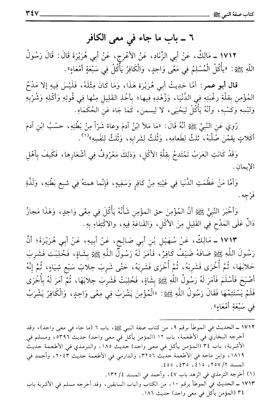 1712 - مَالِكٌ عَنْ أَبِي الزِّنَادِ عَنِ الْأَعْرَجِ عَنْ أَبِي هُرَيْرَةَ قَالَ قَالَ رَسُولُ اللَّهِ صَلَّى اللَّهُ عَلَيْهِ وَسَلَّمَ يَأْكُلُ الْمُسْلِمُ فِي مِعًى وَاحِدٍ وَالْكَافِرُ يَأْكُلُ فِي سَبْعَةِ أَمْعَاءٍ