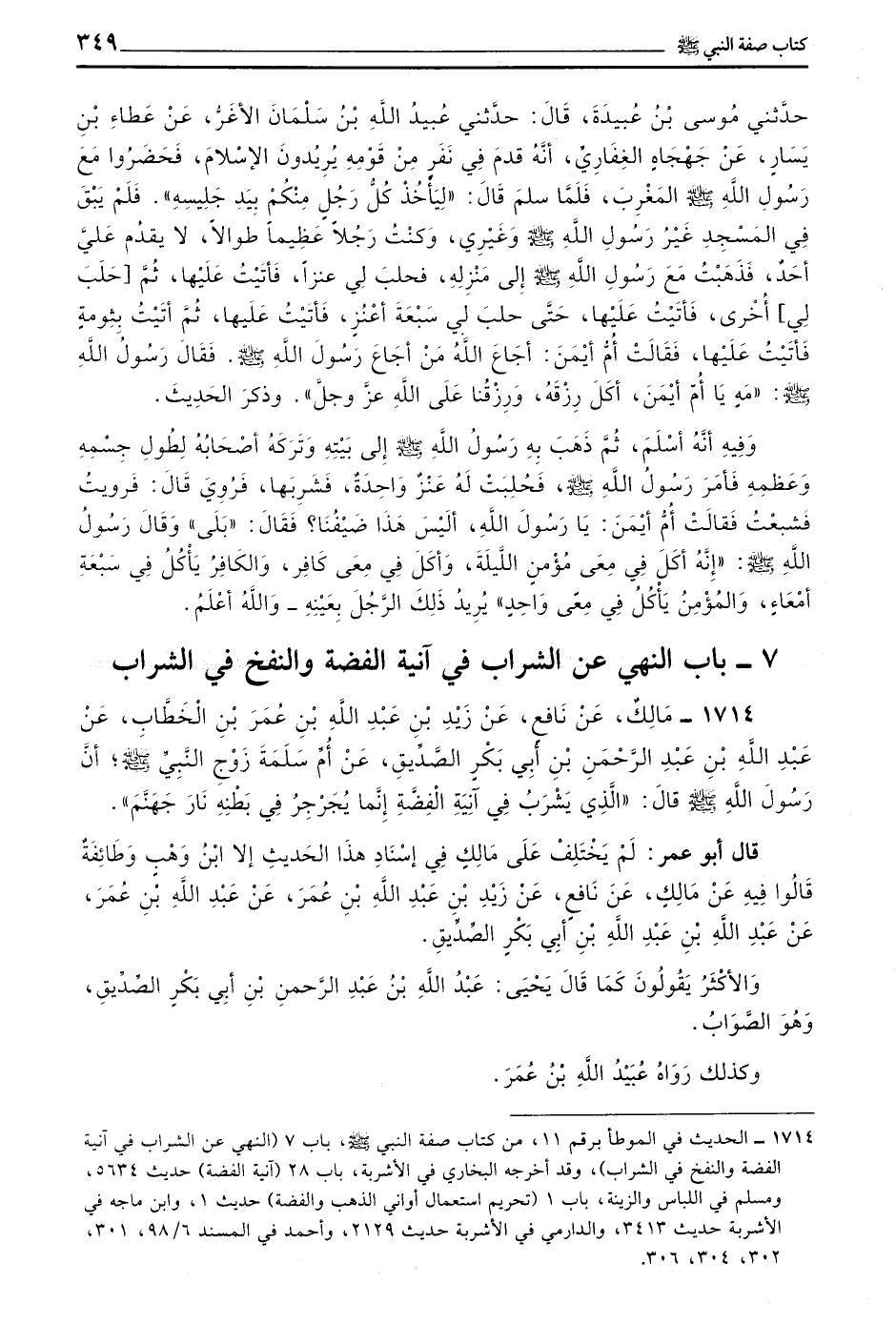 1714 - مَالِكٌ عَنْ نَافِعٍ عَنْ زَيْدِ بْنِ عَبْدِ اللَّهِ بْنِ عُمَرَ بْنِ الْخَطَّابِ عَنْ عَبْدِ اللَّهِ بْنِ عَبْدِ الرَّحْمَنِ بْنِ أَبِي بَكْرٍ الصِّدِّيقِ عَنْ أُمِّ سَلَمَةَ زَوْجِ النَّبِيِّ صَلَّى اللَّهُ عَلَيْهِ وَسَلَّمَ أَنَّ رَسُولَ اللَّهِ صَلَّى اللَّهُ عَلَيْهِ وَسَلَّمَ قَالَ الَّذِي يَشْرَبُ فِي آنِيَةِ الْفِضَّةِ إِنَّمَا يُجَرْجِرُ فِي بَطْنِهِ نَارَ جَهَنَّمَ