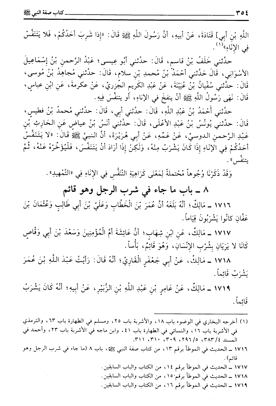 1716 - مَالِكٌ أَنَّهُ بَلَغَهُ أَنَّ عُمَرَ بْنِ الْخَطَّابِ وَعَلِيِّ بْنِ أَبِي طَالِبٍ وَعُثْمَانَ بْنَ عَفَّانَ كَانُوا يَشْرَبُونَ قِيَامًا
