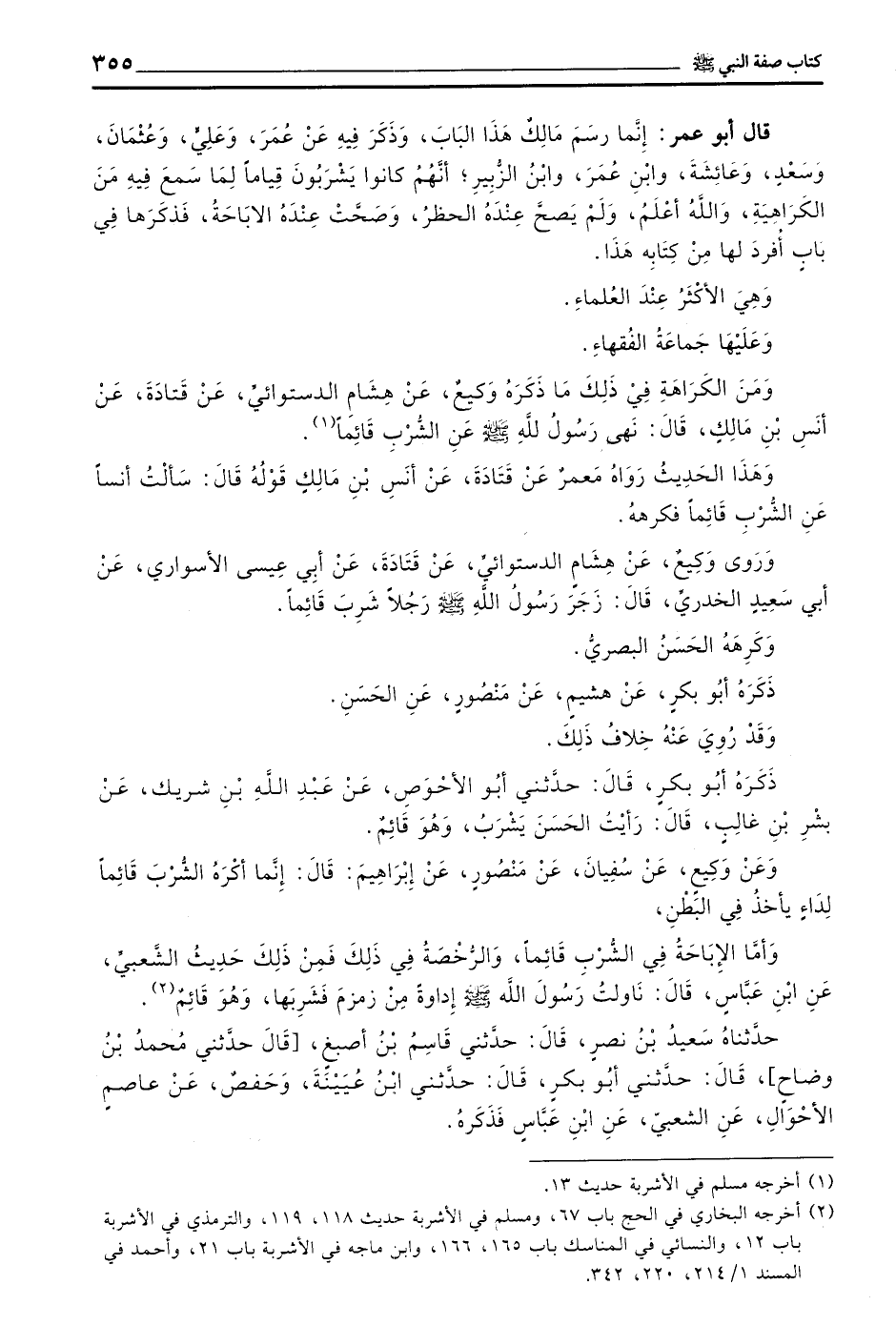 قَالَ أَبُو عُمَرَ إِنَّمَا رَسَمَ مَالِكٌ هَذَا الْبَابَ وَذَكَرَ فِيهِ عَنْ عُمَرَ وَعَلِيٍّ وَعُثْمَانَ وسعد وعائشة وبن عمر وبن الزُّبَيْرِ أَنَّهُمْ كَانُوا يَشْرَبُونَ قِيَامًا لِمَا سُمِعَ فِيهِ مِنَ الْكَرَاهِيَةِ وَاللَّهُ أَعْلَمُ وَلَمْ يَصِحَّ عِنْدَهُ الْحَظْرُ وَصَحَّتْ عِنْدَهُ الْإِبَاحَةُ فَذَكَرَهَا فِي بَابٍ أُفْرِدَ لَهَا مِنْ كِتَابِهِ هَذَا