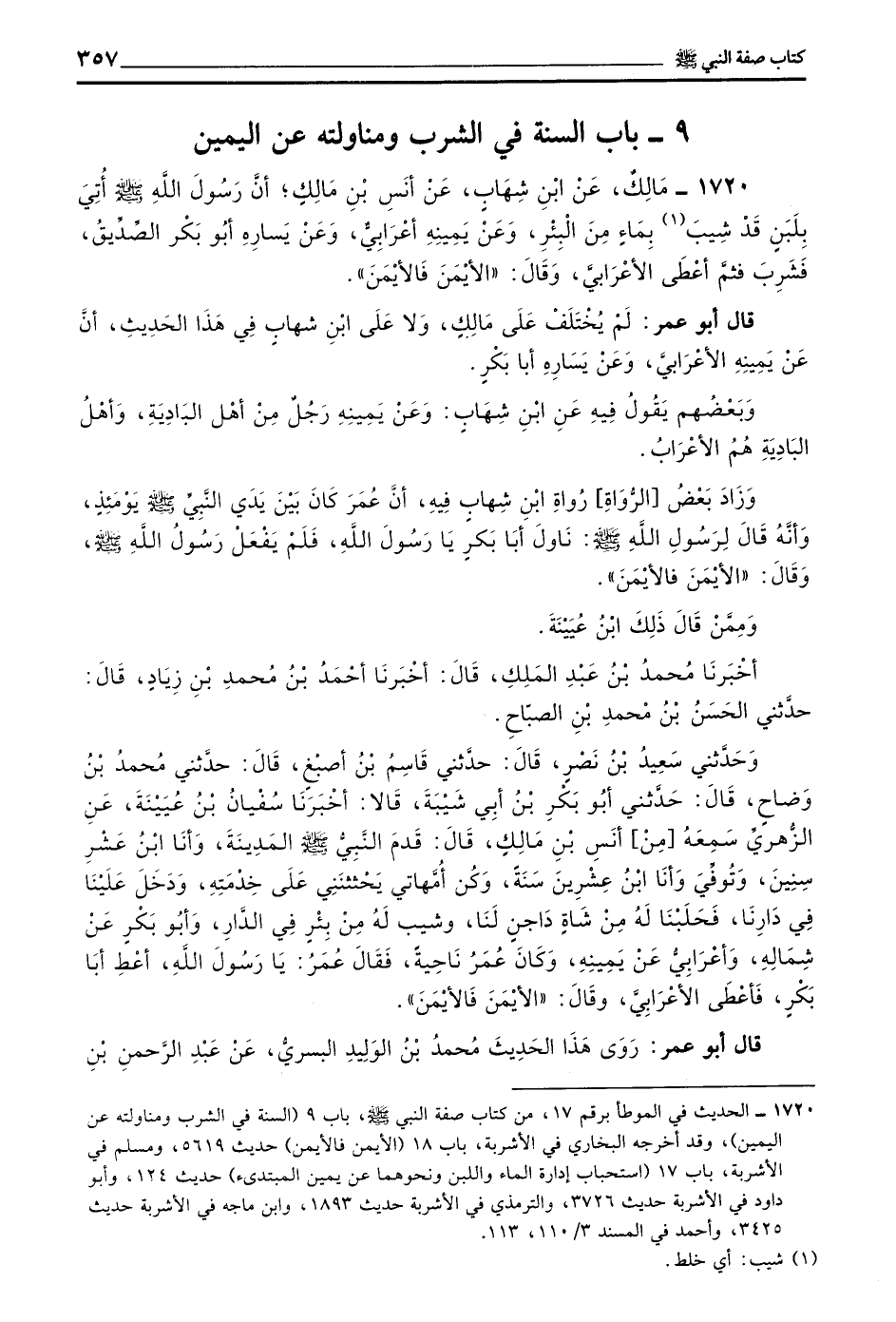 1720 - مالك عن بن شِهَابٍ عَنْ أَنَسِ بْنِ مَالِكٍ أَنَّ رَسُولَ اللَّهِ صَلَّى اللَّهُ عَلَيْهِ وَسَلَّمَ أُتِيَ بِلَبَنٍ قَدْ شِيبَ بِمَاءٍ مِنَ الْبِئْرِ وَعَنْ يَمِينِهِ أَعْرَابِيٌّ وَعَنْ يَسَارِهِ أَبُو بَكْرٍ الصِّدِّيقُ فَشَرِبَ فثم أَعْطَى الْأَعْرَابِيَّ وَقَالَ الْأَيْمَنُ فَالْأَيْمَنُ