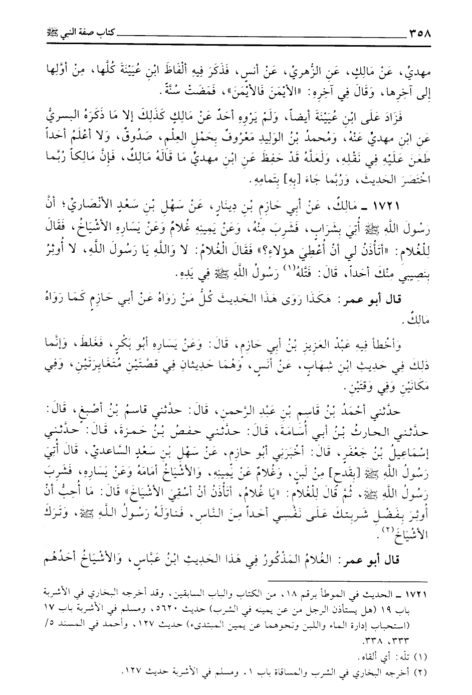 1721 - مَالِكٌ عَنْ أَبِي حَازِمِ بْنِ دِينَارٍ عَنْ سَهْلِ بْنِ سَعْدٍ الْأَنْصَارِيِّ أَنَّ رَسُولَ اللَّهِ صَلَّى اللَّهُ عَلَيْهِ وَسَلَّمَ أُتِيَ بِشَرَابٍ فَشَرِبَ مِنْهُ وَعَنْ يَمِينِهِ غُلَامٌ وَعَنْ يَسَارِهِ الْأَشْيَاخُ فَقَالَ لِلْغُلَامِ أَتَأْذَنُ لِي أَنْ أُعْطِيَ هَؤُلَاءِ فَقَالَ الْغُلَامُ لَا وَاللَّهِ يَا رَسُولَ اللَّهِ لَا أُوثِرُ بِنَصِيبِي مِنْكَ أَحَدًا قَالَ فَتَلَّهُ رَسُولُ اللَّهِ صَلَّى اللَّهُ عَلَيْهِ وَسَلَّمَ فِي يَدِهِ