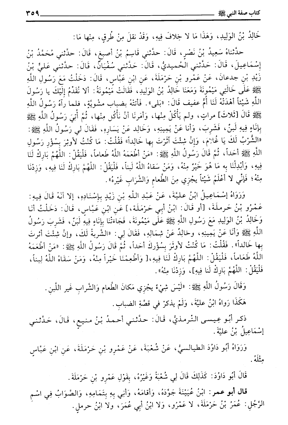 فَأَتَتْهُ بِضِبَابٍ مَشْوِيَّةٍ فَلَمَّا رَآهُ رَسُولُ اللَّهِ صَلَّى اللَّهُ عَلَيْهِ وَسَلَّمَ قَالَ ثَلَاثَ مَرَّاتٍ وَلَمْ يَأْكُلْ مِنْهَا وَأَمَرَنَا أَنْ نَأْكُلَ مِنْهَا ثُمَّ أَتَى رَسُولَ اللَّهِ صَلَّى اللَّهُ عَلَيْهِ وَسَلَّمَ بِإِنَاءٍ فِيهِ لَبَنٌ فَشَرِبَ وَأَنَا عَنْ يَمِينِهِ وَخَالِدٌ عَنْ يَسَارِهِ فَقَالَ لِي رَسُولُ اللَّهِ صَلَّى اللَّهُ عَلَيْهِ وَسَلَّمَ الشُّرْبُ لَكَ يَا غُلَامُ وَإِنْ شِئْتَ آثَرْتَ بِهَا خَالِدًا فَقُلْتُ مَا كُنْتُ لِأُوثِرَ بِسُؤْرِ رَسُولُ اللَّهِ صَلَّى اللَّهُ عَلَيْهِ وَسَلَّمَ أَحَدًا ثُمَّ قَالَ رَسُولُ اللَّهِ صَلَّى اللَّهُ عَلَيْهِ وَسَلَّمَ مَنْ أَطْعَمَهُ اللَّهُ طَعَامًا فَلْيَقُلِ اللَّهُمَّ بَارِكْ لَنَا فِيهِ وَأَبْدِلْنَا بِهِ مَا هُوَ خَيْرٌ مِنْهُ وَمَنْ سَقَاهُ اللَّهُ لَبَنًا فَلْيَقُلِ اللَّهُمَّ بَارِكْ لَنَا فِيهِ وَزِدْنَا منه فإني لا أعلم شيئا يجزئ من الطعام والشراب غيره