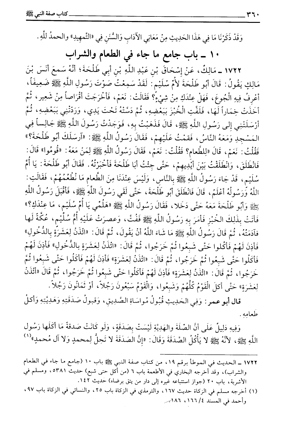 1722 - مَالِكٌ عَنْ إِسْحَاقَ بْنِ عَبْدِ اللَّهِ بْنِ أَبِي طَلْحَةَ أَنَّهُ سَمِعَ أَنَسَ بْنَ مَالِكٍ يَقُولُ قَالَ أَبُو طَلْحَةَ لِأُمِّ سُلَيْمٍ لَقَدْ سَمِعْتُ صَوْتِ رَسُولِ اللَّهِ صَلَّى اللَّهُ عَلَيْهِ وَسَلَّمَ ضَعِيفًا أَعْرِفُ فِيهِ الْجُوعَ فَهَلْ عِنْدَكِ مِنْ شَيْءٍ فَقَالَتْ نَعَمْ فَأَخْرَجَتْ أَقْرَاصًا مِنْ شعير ثم أخذت خمارا لها فَلَفَّتِ الْخُبْزَ بِبَعْضِهِ ثُمَّ دَسَّتْهُ تَحْتَ يَدِي وَرَدَّتْنِي بِبَعْضِهِ ثُمَّ أَرْسَلَتْنِي إِلَى رَسُولِ اللَّهِ صَلَّى اللَّهُ عَلَيْهِ وَسَلَّمَ قَالَ فَذَهَبْتُ بِهِ فَوَجَدْتُ رَسُولَ اللَّهِ صَلَّى اللَّهُ عَلَيْهِ وَسَلَّمَ جَالِسًا فِي الْمَسْجِدِ وَمَعَهُ النَّاسُ فَقُمْتُ عَلَيْهِمْ فَقَالَ رَسُولُ اللَّهِ صَلَّى اللَّهُ عَلَيْهِ وَسَلَّمَ أَرْسَلَكَ أَبُو طَلْحَةَ فَقُلْتُ نَعَمْ قَالَ لِلطَّعَامِ فَقُلْتُ نَعَمْ فَقَالَ رَسُولُ اللَّهِ صَلَّى اللَّهُ عَلَيْهِ وَسَلَّمَ لِمَنْ مَعَهُ قُومُوا قَالَ فَانْطَلَقَ وَانْطَلَقْتُ بَيْنَ أَيْدِيهِمْ حَتَّى جِئْتُ أَبَا طَلْحَةَ فَأَخْبَرْتُهُ