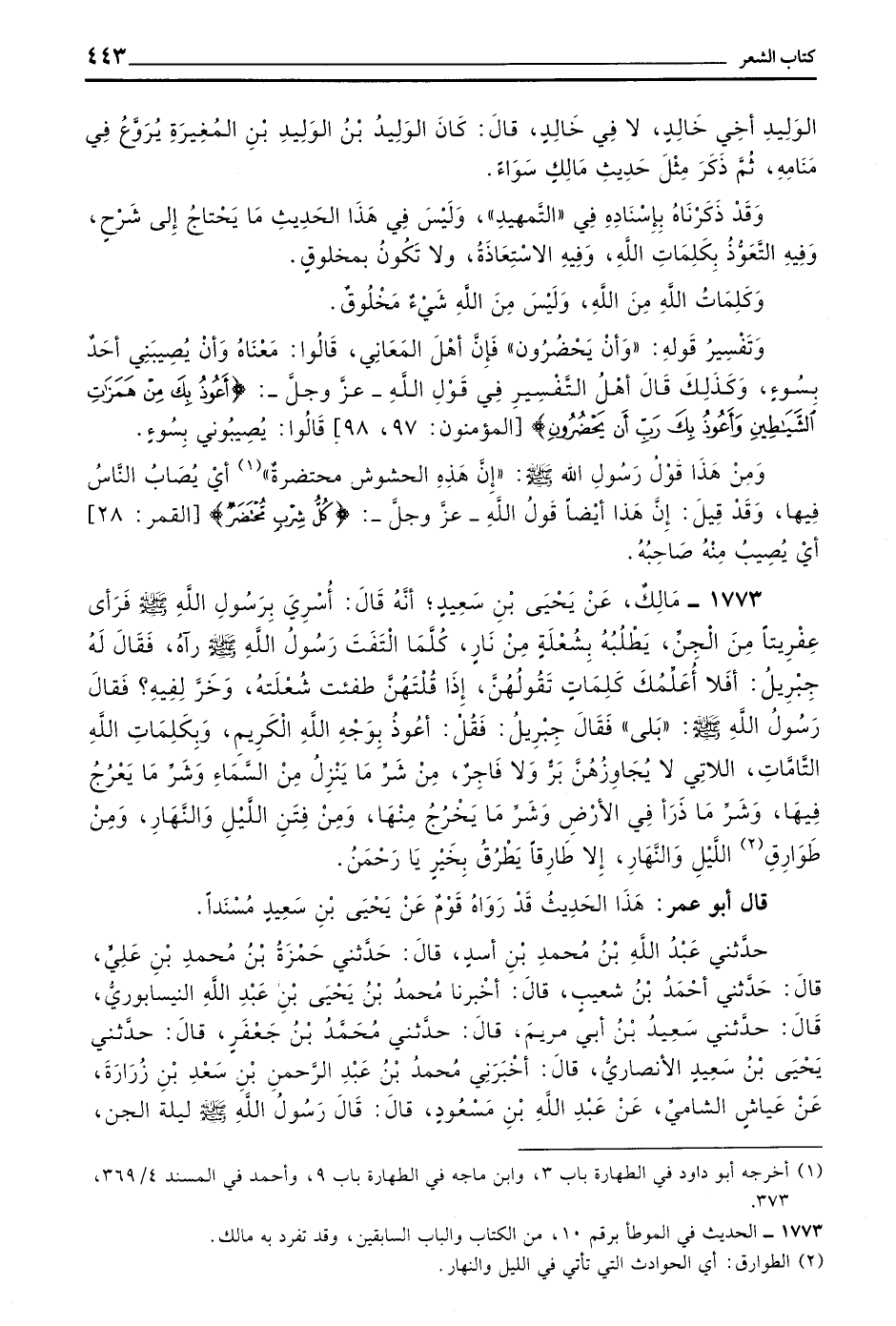 1773 - مَالِكٌ عَنْ يَحْيَى بْنِ سَعِيدٍ أَنَّهُ قَالَ أُسْرِيَ بِرَسُولِ اللَّهِ صَلَّى اللَّهُ عَلَيْهِ وَسَلَّمَ فَرَأَى عِفْرِيتًا مِنَ الْجِنِّ يَطْلُبُهُ بِشُعْلَةٍ من نار كُلَّمَا الْتَفَتَ رَسُولُ اللَّهِ صَلَّى اللَّهُ عَلَيْهِ وَسَلَّمَ رَآهُ فَقَالَ لَهُ جِبْرِيلُ أَفَلَا أُعَلِّمُكَ كَلِمَاتٍ تَقُولُهُنَّ إِذَا قُلْتَهُنَّ طَفِئْتَ شُعْلَتُهُ وَخَرَّ لِفِيهِ فَقَالَ رَسُولُ اللَّهِ صَلَّى اللَّهُ عَلَيْهِ وَسَلَّمَ بَلَى فَقَالَ جِبْرِيلُ فَقُلْ أَعُوذُ بِوَجْهِ اللَّهِ الْكَرِيمِ وَبِكَلِمَاتِ اللَّهِ التَّامَّاتِ اللَّاتِي لَا يُجَاوِزُهُنَّ بَرٌّ وَلَا فَاجِرٌ مِنْ شَرِّ مَا يَنْزِلُ مِنَ السَّمَاءِ وَشَرِّ مَا يُعْرُجُ فِيهَا وَشَرِّ مَا ذَرَأَ فِي الْأَرْضِ وَشَرِّ مَا يَخْرُجُ مِنْهَا وَمِنْ فِتَنِ اللَّيْلِ وَالنَّهَارِ وَمِنْ طَوَارِقِ اللَّيْلِ وَالنَّهَارِ إِلَّا طَارِقًا يَطْرُقُ بِخَيْرٍ يَا رَحْمَنُ