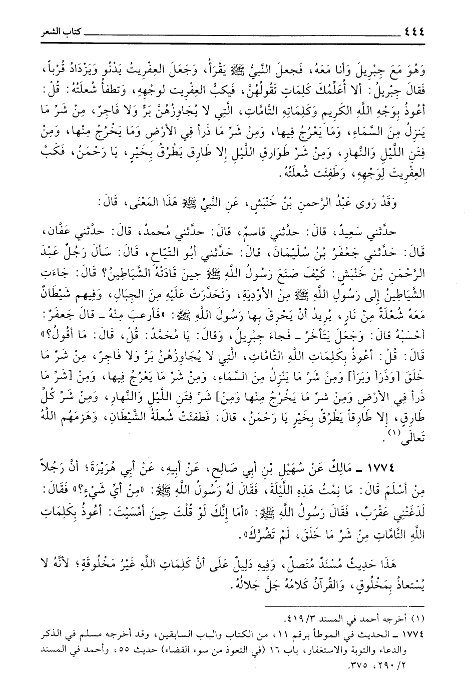 وَقَدْ رَوَى عَبْدُ الرَّحْمَنِ بْنُ خَنْبَشٍ عَنِ النَّبِيِّ صَلَّى اللَّهُ عَلَيْهِ وَسَلَّمَ هَذَا الْمَعْنَى قَالَ حَدَّثَنِي سَعِيدٌ قَالَ حَدَّثَنِي قَاسِمٌ قَالَ حَدَّثَنِي مُحَمَّدٌ قَالَ حَدَّثَنِي عَفَّانُ قَالَ حَدَّثَنِي جَعْفَرُ بْنُ سُلَيْمَانَ قَالَ حَدَّثَنِي أَبُو التَّيَّاحِ قَالَ سَأَلَ رَجُلٌ عَبْدَ الرَّحْمَنِ بْنَ خَنْبَشٍ كَيْفَ صَنَعَ رَسُولُ اللَّهِ صَلَّى اللَّهُ عَلَيْهِ وَسَلَّمَ حِينَ قَادَتْهُ الشَّيَاطِينُ قَالَ جَاءَتِ الشَّيَاطِينُ إِلَى رَسُولِ اللَّهِ صَلَّى اللَّهُ عَلَيْهِ وَسَلَّمَ مِنَ الْأَوْدِيَةِ وَتَحَدَّرَتْ عَلَيْهِ مِنَ الْجِبَالِ وَفِيهِمْ شَيْطَانٌ مَعَهُ شُعْلَةٌ مِنْ نَارٍ يُرِيدُ أَنْ يَحْرِقَ بِهَا رَسُولُ اللَّهِ صَلَّى اللَّهُ عَلَيْهِ وَسَلَّمَ فَأُرْعِبُ مِنْهُ - قَالَ جَعْفَرٌ أَحْسَبُهُ قَالَ وَجَعَلَ يَتَأَخَّرُ - فَجَاءَ جِبْرِيلُ وَقَالَ يَا مُحَمَّدُ قُلْ قَالَ مَا أَقُولُ قَالَ قُلْ أَعُوذُ بِكَلِمَاتِ اللَّهِ التَّامَّاتِ الَّتِي لَا يُجَاوِزُهُنَّ بَرٌّ وَلَا فَاجِرٌ مِنْ شَرِّ مَا خَلَقَ وَذَرَأَ وَبَرَأَ وَمِنْ شَرِّ مَا يَنْزِلُ مِنَ السَّمَاءِ وَمِنْ شَرِّ مَا يَعْرُجُ فِيهَا وَمِنْ شَرِّ مَا ذَرَأَ فِي الْأَرْضِ وَمِنْ شَرِّ مَا يَخْرُجُ مِنْهَا وَمِنْ شَرِّ فِتَنِ اللَّيْلِ وَالنَّهَارِ وَمِنْ شَرِّ كُلِّ طَارِقٍ إِلَّا طَارِقًا يَطْرُقُ بِخَيْرٍ يَا رَحْمَنُ قَالَ فَطُفِئَتْ شُعْلَةُ الشَّيْطَانِ وَهَزَمَهُمُ اللَّهُ تَعَالَى 1774 - مَالِكٌ عَنْ سُهَيْلِ بْنِ أَبِي صَالِحٍ عَنْ أَبِيهِ عَنْ أَبِي هُرَيْرَةَ أَنَّ رَجُلًا مِنْ أَسْلَمَ قَالَ مَا نِمْتُ هَذِهِ اللَّيْلَةَ فَقَالَ لَهُ رَسُولُ اللَّهِ صَلَّى اللَّهُ عَلَيْهِ وسلم من أَيِّ شَيْءٍ فَقَالَ لَدَغَتْنِي عَقْرَبٌ فَقَالَ رَسُولُ اللَّهِ صَلَّى اللَّهُ عَلَيْهِ وَسَلَّمَ أَمَّا إِنَّكَ لَوْ قُلْتَ حِينَ أَمْسَيْتَ أَعُوذُ بِكَلِمَاتِ اللَّهِ التَّامَّاتِ مِنْ شَرِّ مَا خَلَقَ لَمْ تَضُرَّكَ