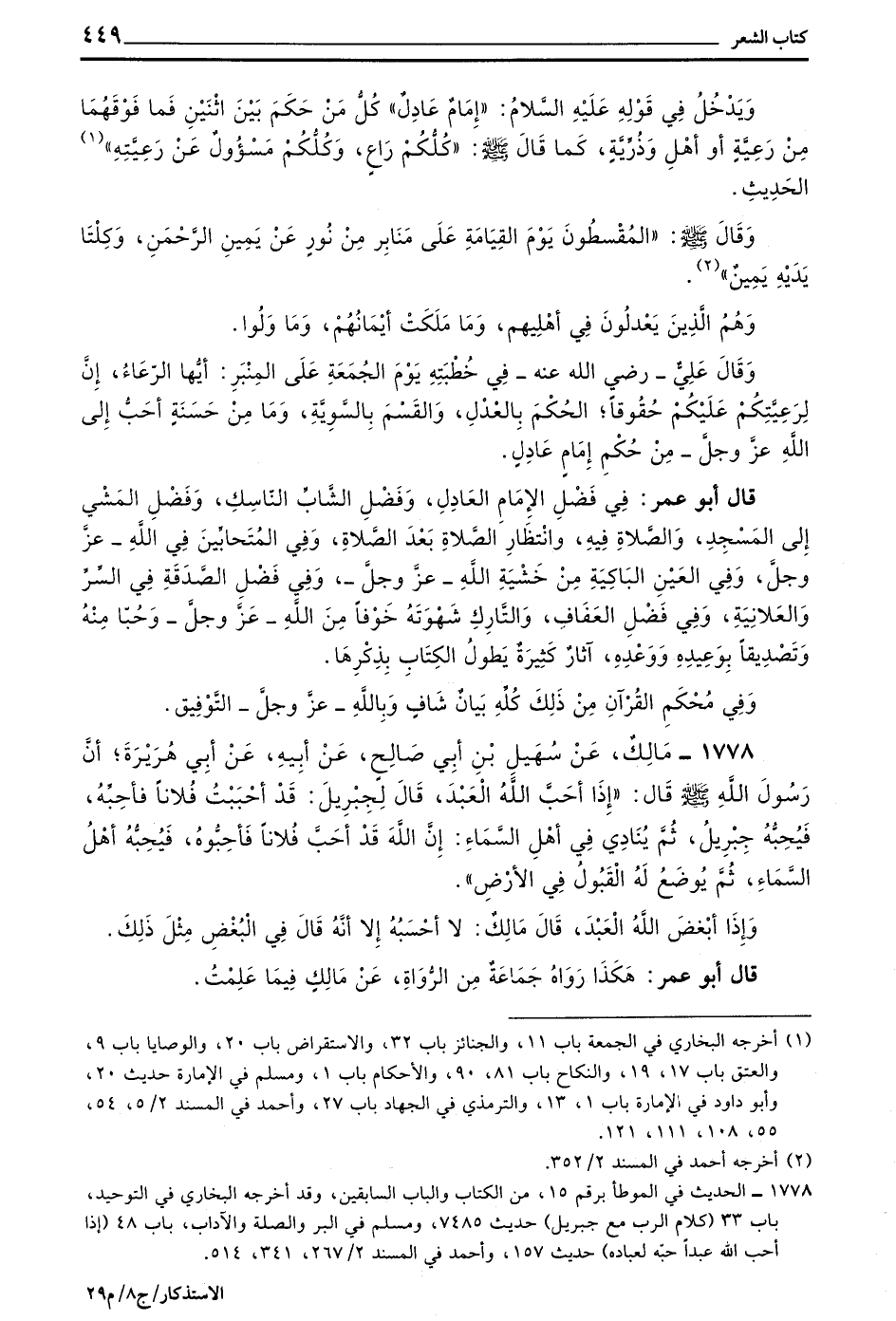 قَالَ أَبُو عُمَرَ فِي فَضْلِ الْإِمَامِ الْعَادِلِ وَفَضْلِ الشَّابِّ النَّاسِكِ وَفَضْلِ الْمَشْيِ إِلَى الْمَسْجِدِ وَالصَّلَاةِ فِيهِ وَانْتِظَارِ الصَّلَاةِ بَعْدَ الصَّلَاةِ وَفِي الْمُتَحَابِّينَ فِي اللَّهِ - عَزَّ وَجَلَّ وَفِي الْعَيْنِ الْبَاكِيَةِ مِنْ خَشْيَةِ اللَّهِ - عَزَّ وَجَلَّ - وَفِي فَضْلِ الصَّدَقَةِ فِي السِّرِّ وَالْعَلَانِيَةِ وَفِي فَضْلِ الْعَفَافِ وَالتَّارِكِ شَهْوَتَهُ خَوْفًا مِنَ اللَّهِ - عَزَّ وَجَلَّ - وَحُبًّا مِنْهُ وَتَصْدِيقًا بِوَعِيدِهِ وَوَعْدِهِ آثَارٌ كَثِيرَةٌ يَطُولُ الْكِتَابُ بِذِكْرِهَا