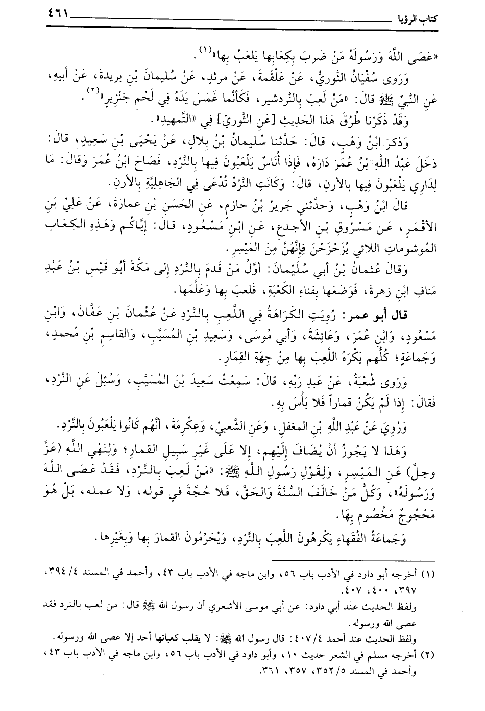 وَهَذَا لَا يَجُوزُ أَنْ يُضَافَ إِلَيْهِمْ إِلَّا عَلَى غَيْرِ سَبِيلِ الْقِمَارِ وَلِنَهْيِ اللَّهِ (عَزَّ وَجَلَّ) عَنِ الْمَيْسِرِ وَلِقَوْلِ رَسُولِ اللَّهِ صَلَّى اللَّهُ عَلَيْهِ وَسَلَّمَ من لَعِبَ بِالنَّرْدِ فَقَدْ عَصَى اللَّهَ وَرَسُولَهُ وَكُلُّ مَنْ خَالَفَ السُّنَّةَ وَالْحَقَّ فَلَا حُجَّةَ فِي قَوْلِهِ وَلَا عَمَلِهِ بَلْ هُوَ مَحْجُوجٌ مَخْصُومٌ بِهَا