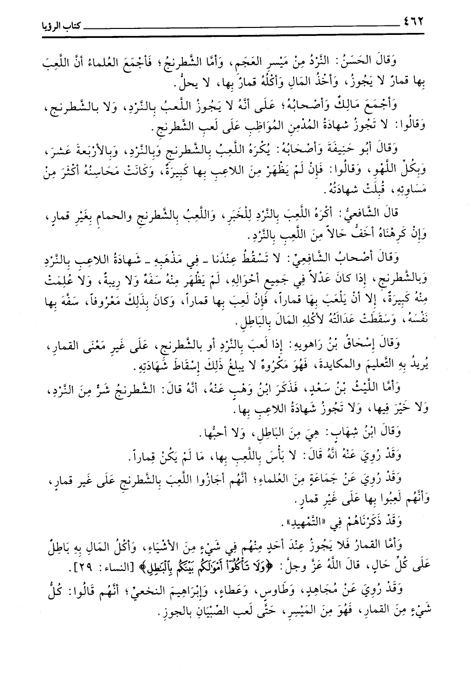 وَأَمَّا الْقِمَارُ فَلَا يَجُوزُ عِنْدَ أَحَدٍ مِنْهُمْ فِي شَيْءٍ مِنَ الْأَشْيَاءِ وَأَكْلُ الْمَالِ بِهِ بَاطِلٌ عَلَى كُلِّ حَالٍ قَالَ اللَّهِ عَزَّ وَجَلَّ (وَلَا تَأْكُلُوا أَمْوَالَكُمْ بَيْنَكُمْ بالبطل) النِّسَاءِ 29