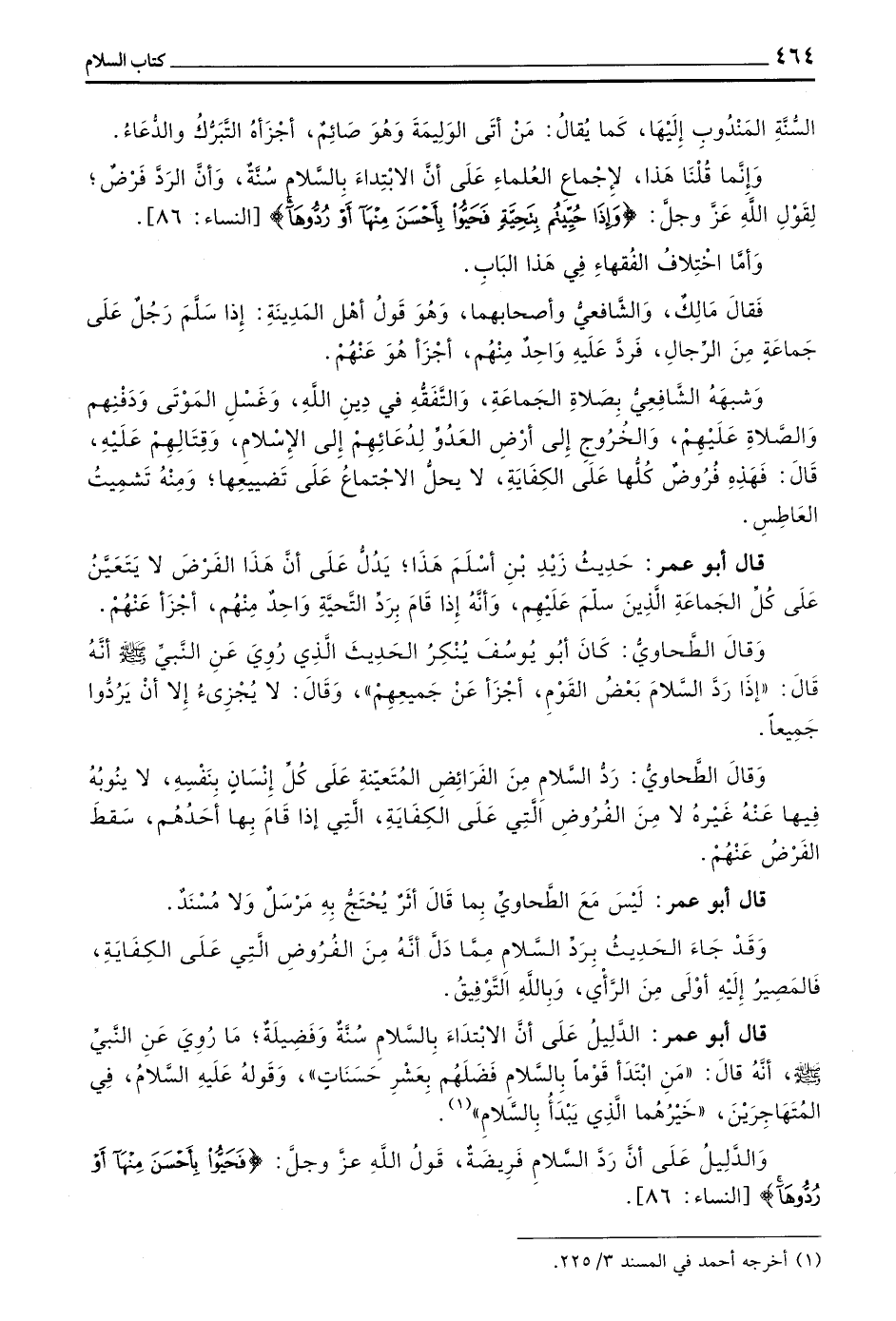 وَقَالَ الطَّحَاوِيُّ رَدُّ السَّلَامِ مِنَ الْفَرَائِضِ الْمُتَعَيَّنَةِ عَلَى كُلِّ إِنْسَانٍ بِنَفْسِهِ لَا يَنُوبُهُ فِيهَا عَنْهُ غَيْرُهُ لَا مِنَ الْفُرُوضِ الَّتِي عَلَى الْكِفَايَةِ الَّتِي إِذَا قَامَ بِهَا أَحَدُهُمْ سَقَطَ الْفَرْضُ عَنْهُمْ قَالَ أَبُو عُمَرَ لَيْسَ مَعَ الطَّحَاوِيِّ بِمَا قَالَ أَثَرٌ يُحْتَجُّ بِهِ مُرْسَلٌ وَلَا مُسْنَدٌ