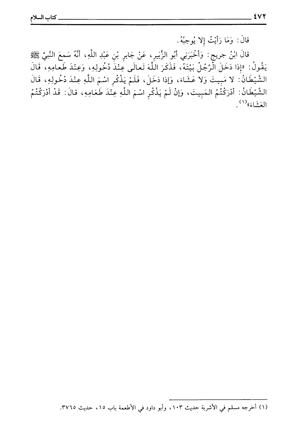قال بن جُرَيْجٍ وَأَخْبَرَنِي أَبُو الزُّبَيْرِ عَنْ جَابِرِ بْنِ عَبْدِ اللَّهِ أَنَّهُ سَمِعَ النَّبِيَّ صَلَّى اللَّهُ عَلَيْهِ وَسَلَّمَ يَقُولُ إِذَا دَخَلَ الرَّجُلُ بَيْتَهُ فَذَكَرَ اللَّهَ تَعَالَى عِنْدَ دُخُولِهِ وَعِنْدَ طَعَامِهِ قَالَ الشَّيْطَانُ لَا مَبِيتَ وَلَا عَشَاءَ وَإِذَا دَخَلَ فَلَمْ يُذْكَرِ اسْمَ اللَّهِ عِنْدَ دُخُولِهِ قَالَ الشَّيْطَانُ أَدْرَكْتُمُ الْمَبِيتَ وَإِنْ لَمْ يَذْكُرِ اسْمَ اللَّهِ عِنْدَ طَعَامِهِ قَالَ قَدْ أَدْرَكْتُمُ العشاء