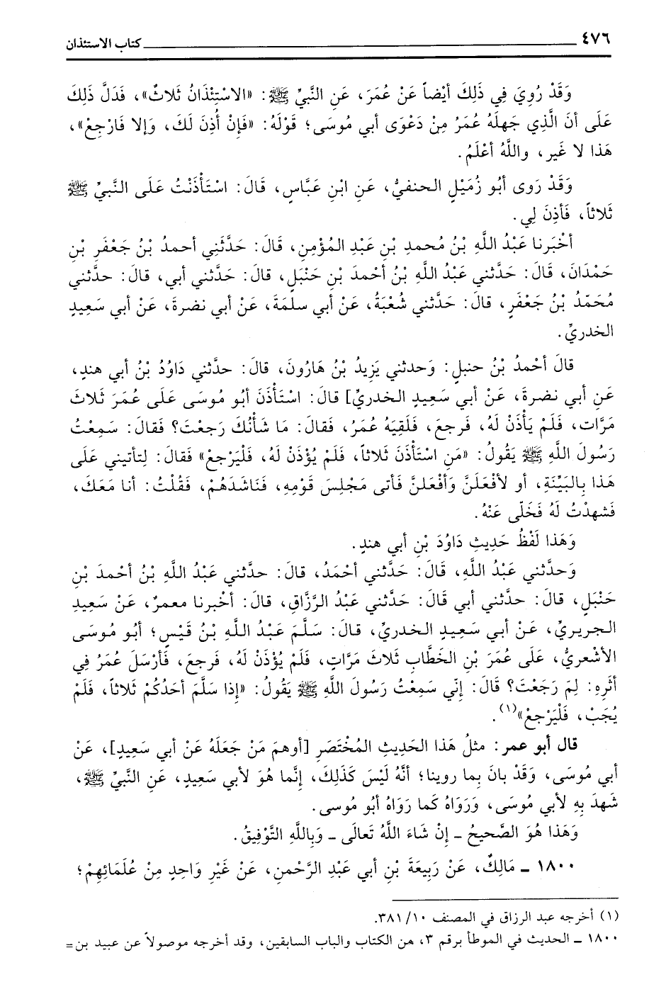 قَالَ أَحْمَدُ بْنُ حَنْبَلٍ وَحَدَّثَنِي يَزِيدُ بْنُ هَارُونَ قَالَ حَدَّثَنِي دَاوُدُ بْنُ أَبِي هِنْدٍ عَنْ أَبِي نَضْرَةَ عَنْ أَبِي سَعِيدٍ الْخُدْرِيِّ قَالَ اسْتَأْذَنَ أَبُو مُوسَى عَلَى عُمَرَ ثَلَاثَ مَرَّاتٍ فَلَمْ يَأْذَنْ لَهُ فَرَجَعَ فَلَقِيَهُ عُمَرُ فَقَالَ مَا شَأْنُكَ رَجَعْتَ فَقَالَ سَمِعْتُ رَسُولَ اللَّهِ صَلَّى اللَّهُ عَلَيْهِ وَسَلَّمَ يقول من اسْتَأْذَنَ ثَلَاثًا فَلَمْ يُؤْذَنْ لَهُ فَلْيَرْجِعْ فَقَالَ لِتَأْتِينِي عَلَى هَذَا بِالْبَيِّنَةِ أَوْ لَأَفْعَلَنَّ وَأَفْعَلَنَّ فَأَتَى مَجْلِسَ قَوْمِهِ فَنَاشَدَهُمْ فَقُلْتُ أَنَا مَعَكَ فَشَهِدْتُ لَهُ فَخَلَّى عَنْهُ