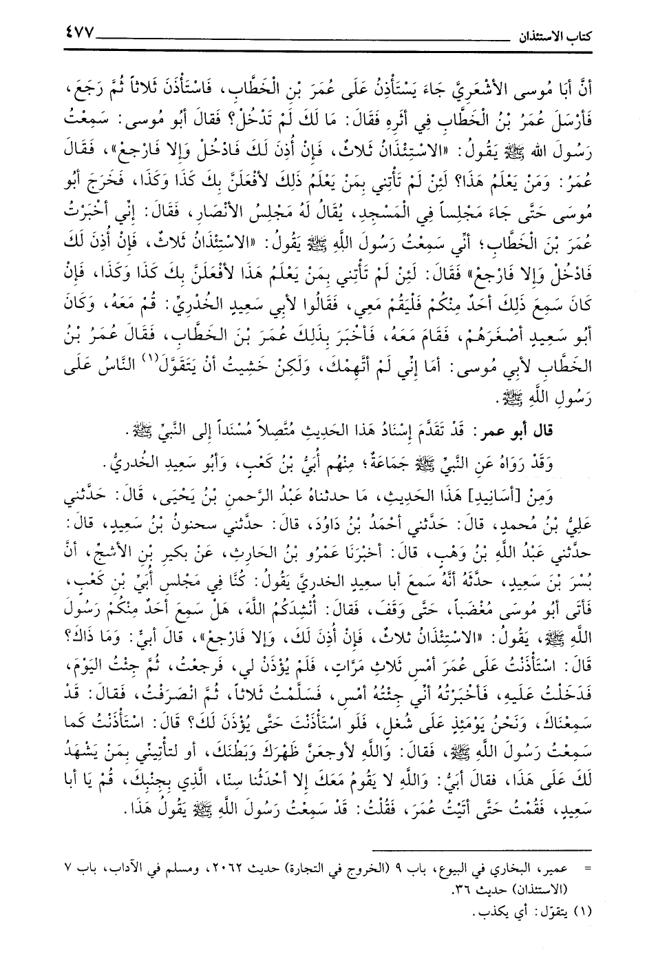 أَنَّ أَبَا مُوسَى الْأَشْعَرِيَّ جَاءَ يَسْتَأْذِنُ عَلَى عُمَرَ بْنِ الْخَطَّابِ فَاسْتَأْذَنَ ثَلَاثًا ثُمَّ رَجَعَ فَأَرْسَلَ عُمَرُ بْنُ الْخَطَّابِ فِي أَثَرِهِ فَقَالَ مَا لَكَ لَمْ تَدْخُلْ فَقَالَ أَبُو مُوسَى سَمِعْتُ رَسُولَ اللَّهِ صَلَّى اللَّهُ عَلَيْهِ وَسَلَّمَ يَقُولُ الِاسْتِئْذَانُ ثَلَاثٌ فَإِنْ أُذِنَ لَكَ فَادْخُلْ وَإِلَّا فَارْجِعْ فَقَالَ عُمَرُ وَمَنْ يَعْلَمُ هَذَا لَئِنْ لَمْ تَأْتِنِي بِمَنْ يَعْلَمُ ذَلِكَ لَأَفْعَلَنَّ بِكَ كَذَا وَكَذَا فَخَرَجَ أَبُو مُوسَى حَتَّى جَاءَ مَجْلِسًا فِي الْمَسْجِدِ يُقَالُ لَهُ مَجْلِسُ الْأَنْصَارِ فَقَالَ إِنِّي أَخْبَرْتُ عُمَرَ بْنَ الْخَطَّابِ أني سَمِعْتُ رَسُولَ اللَّهِ صَلَّى اللَّهُ عَلَيْهِ وَسَلَّمَ يَقُولُ الِاسْتِئْذَانُ ثَلَاثٌ فَإِنْ أُذِنَ لَكَ فَادْخُلْ وَإِلَّا فَارْجِعْ فَقَالَ لَئِنْ لَمْ تَأْتِنِي بِمَنْ يَعْلَمُ هَذَا لَأَفْعَلَنَّ بِكَ كَذَا وَكَذَا فَإِنْ كَانَ سَمِعَ ذَلِكَ أَحَدٌ مِنْكُمْ فَلْيَقُمْ مَعِي فَقَالُوا لِأَبِي سَعِيدٍ الْخُدْرِيِّ قُمْ مَعَهُ وَكَانَ أَبُو سَعِيدٍ أَصْغَرَهُمْ فَقَامَ مَعَهُ فَأَخْبَرَ بِذَلِكَ عُمَرَ بْنَ الْخَطَّابِ فَقَالَ عُمَرُ بْنُ الْخَطَّابِ لِأَبِي مُوسَى أَمَا إِنِّي لَمْ أَتَّهِمْكَ وَلَكِنْ خَشِيتُ أَنْ يَتَقَوَّلَ النَّاسُ عَلَى رَسُولِ اللَّهِ صَلَّى اللَّهُ عَلَيْهِ وَسَلَّمَ