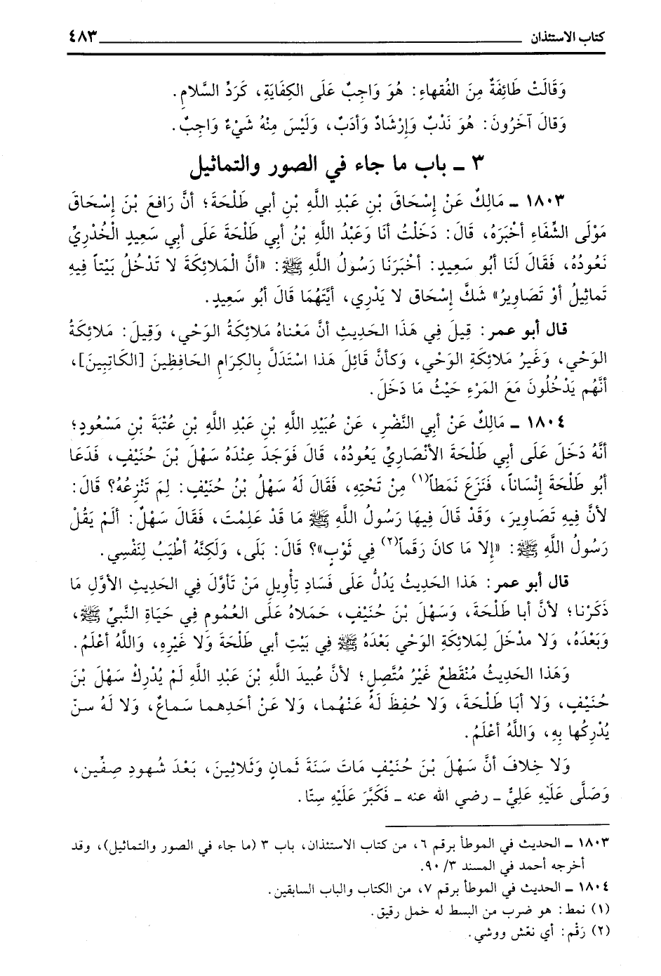 1804 - مَالِكٌ عَنْ أَبِي النَّضِرِ عَنْ عَبِيدِ اللَّهِ بْنِ عَبْدِ اللَّهِ بْنِ عُتْبَةَ بْنِ مَسْعُودٍ أَنَّهُ دَخَلَ عَلَى أَبِي طَلْحَةَ الْأَنْصَارِيِّ يَعُودُهُ قَالَ فَوَجَدَ عِنْدَهُ سَهْلَ بْنَ حُنَيْفٍ فَدَعَا أَبُو طَلْحَةَ إِنْسَانًا فَنَزَعَ نَمَطًا مِنْ تَحْتِهِ فَقَالَ لَهُ سَهْلُ بْنُ حُنَيْفٍ لِمَ تَنْزِعُهُ قَالَ لِأَنَّ فِيهِ تَصَاوِيرَ وَقَدْ قَالَ فِيهَا رَسُولُ اللَّهِ صَلَّى اللَّهُ عَلَيْهِ وَسَلَّمَ مَا قَدْ عَلِمْتَ فَقَالَ سَهْلٌ أَلَمْ يَقُلْ رَسُولُ اللَّهِ صَلَّى اللَّهُ عَلَيْهِ وَسَلَّمَ إِلَّا مَا كَانَ رَقْمًا فِي ثَوْبٍ قَالَ بَلَى وَلَكِنَّهُ أَطْيَبُ لِنَفْسِي