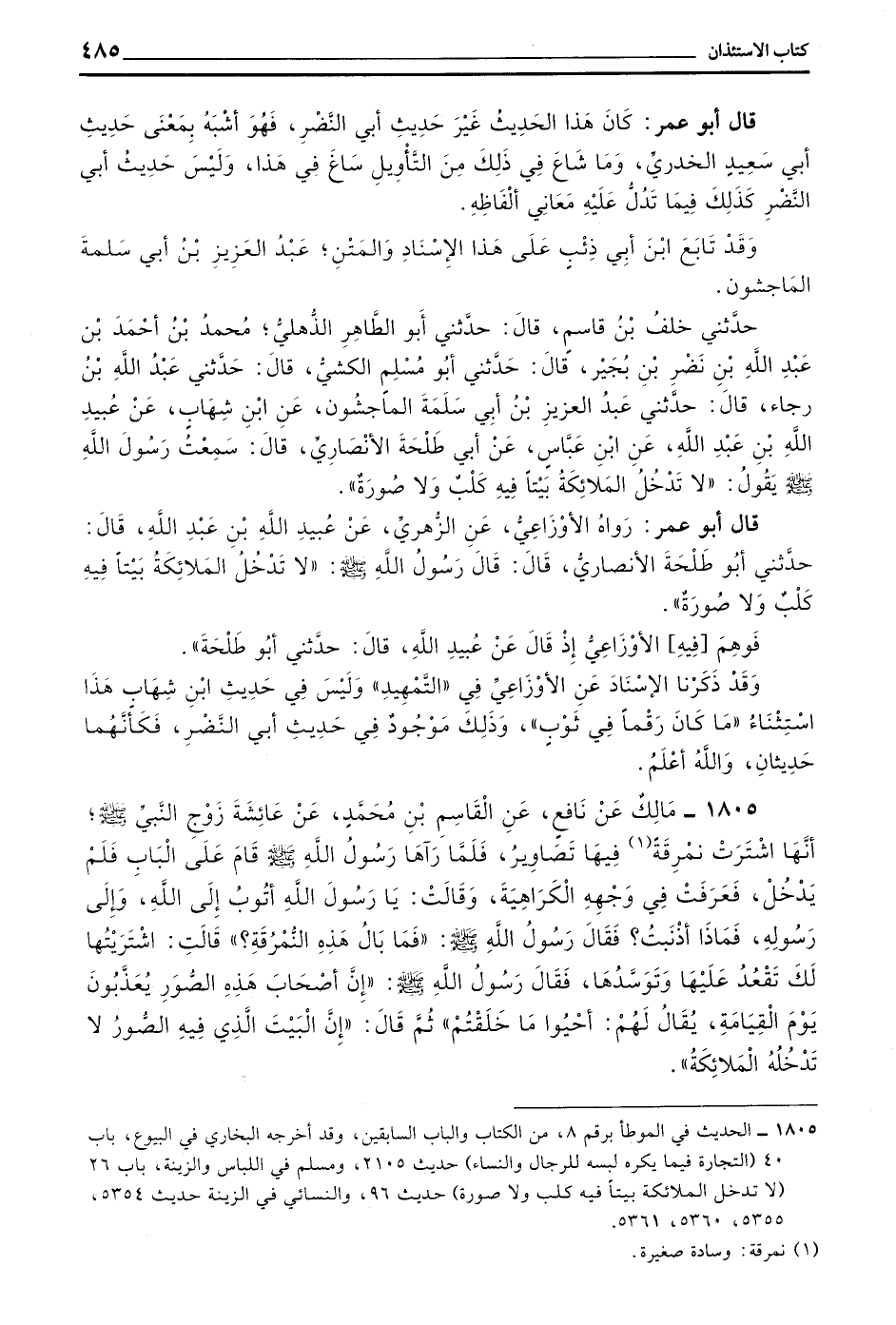 1805 - مَالِكٌ عَنْ نَافِعٍ عَنِ الْقَاسِمِ بْنِ مُحَمَّدٍ عَنْ عَائِشَةَ زَوْجِ النَّبِيِّ صَلَّى اللَّهُ عَلَيْهِ وَسَلَّمَ أَنَّهَا اشْتَرَتْ نُمْرُقَةً فِيهَا تَصَاوِيرُ فَلَمَّا رَآهَا رَسُولَ اللَّهِ صَلَّى اللَّهُ عَلَيْهِ وَسَلَّمَ قَامَ عَلَى الْبَابِ فَلَمْ يَدْخُلْ فَعَرَفْتُ فِي وَجْهِهِ الْكَرَاهِيَةَ وَقَالَتْ يَا رَسُولَ اللَّهِ أَتُوبُ إِلَى اللَّهِ وَإِلَى رَسُولِهِ فَمَاذَا أَذْنَبْتُ فَقَالَ رَسُولُ اللَّهِ صَلَّى اللَّهُ عَلَيْهِ وَسَلَّمَ فَمَا بَالُ هَذِهِ النُّمْرُقَةِ قَالَتْ اشْتَرَيْتُهَا لَكَ تَقْعُدُ عَلَيْهَا وَتَوَسَّدُهَا فَقَالَ رَسُولُ اللَّهِ صَلَّى اللَّهُ عَلَيْهِ وَسَلَّمَ أن أَصْحَابَ هَذِهِ الصُّوَرِ يُعَذَّبُونَ يَوْمَ الْقِيَامَةِ يُقَالُ لَهُمْ أَحْيُوا مَا خَلَقْتُمْ ثُمَّ قَالَ إِنَّ البيت الذي فيه الصور لَا تَدْخُلُهُ الْمَلَائِكَةُ