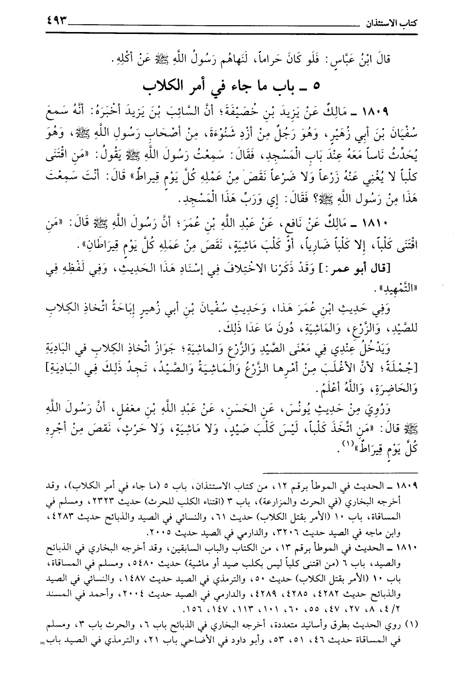 1810 - مَالِكٌ عَنْ نَافِعٍ عَنْ عَبْدِ اللَّهِ بْنِ عُمَرَ أَنَّ رَسُولَ اللَّهِ صَلَّى اللَّهُ عَلَيْهِ وسلم قال من اقْتَنَى كَلْبًا إِلَّا كَلْبًا ضَارِيًا أَوْ كَلْبَ مَاشِيَةٍ نَقَصَ مِنْ عَمَلِهِ كُلَّ يَوْمٍ قِيرَاطَانِ