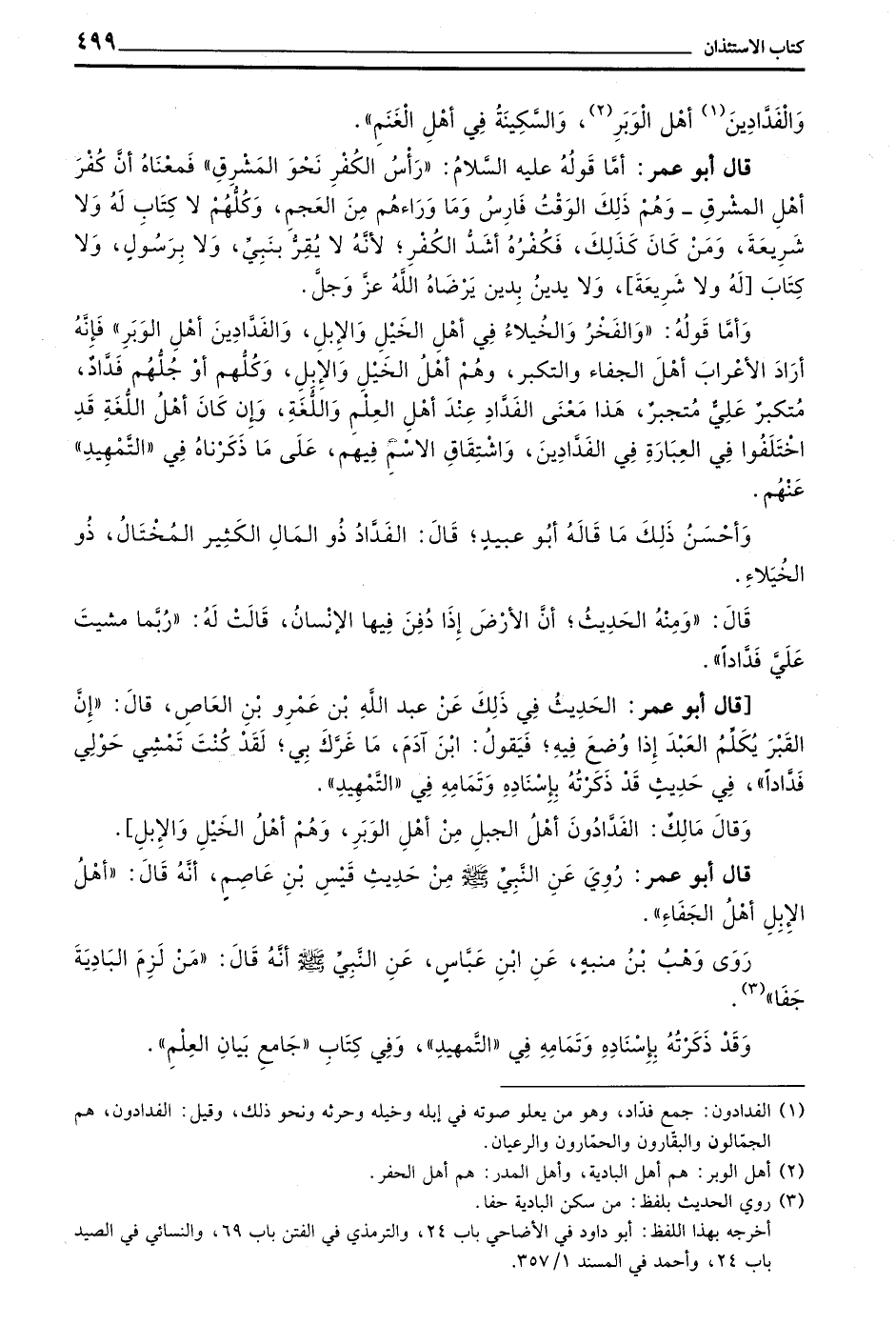 وَأَمَّا قَوْلُهُ وَالْفَخْرُ وَالْخُيَلَاءُ فِي أَهْلِ الْخَيْلِ وَالْإِبِلِ وَالْفَدَّادِينَ أَهْلِ الْوَبَرِ فَإِنَّهُ أَرَادَ الْأَعْرَابَ أَهْلَ الْجَفَاءِ وَالتَّكَبُّرِ وَهُمْ أَهْلُ الْخَيْلِ وَالْإِبِلِ وَكُلُّهُمْ أَوْ جُلُّهُمْ فَدَّادٌ مُتَكَبِّرٌ عَلِيٌّ مُتَجَبِّرٌ هَذَا مَعْنَى الْفَدَّادِ عِنْدَ أَهْلِ الْعِلْمِ وَاللُّغَةِ وَإِنْ كَانَ أَهْلُ اللُّغَةِ قَدِ اخْتَلَفُوا فِي الْعِبَارَةِ فِي الْفَدَّادِينَ وَاشْتِقَاقِ الْاسْمِ فِيهِمْ عَلَى مَا ذَكَرْنَاهُ فِي التَّمْهِيدِ عَنْهُمْ