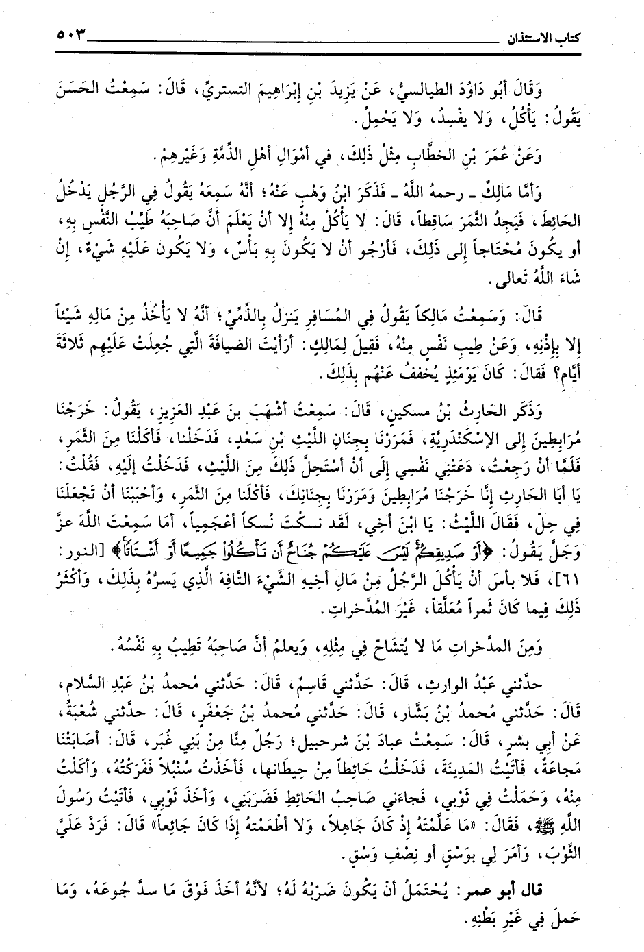 وَذَكَرَ الْحَارِثُ بْنُ مِسْكِينٍ قَالَ سَمِعْتُ أَشْهَبَ بْنَ عَبْدِ الْعَزِيزِ يَقُولُ خَرَجْنَا مُرَابِطِينَ إِلَى الْإِسْكَنْدَرِيَّةِ فَمَرَرْنَا بِجِنَانِ اللَّيْثِ بْنِ سَعْدٍ فَدَخَلْنَا فَأَكَلْنَا مِنَ الثَّمَرِ فَلَمَّا أَنْ رَجَعْتُ دعتني نفسي إلى أَنْ أَسْتَحِلَّ ذَلِكَ مِنَ اللَّيْثِ فَدَخَلْتُ إِلَيْهِ فَقُلْتُ يَا أَبَا الْحَارِثِ إِنَّا خَرَجْنَا مُرَابِطِينَ وَمَرَرْنَا بِجِنَانِكَ فَأَكَلْنَا مِنَ الثَّمَرِ وَأَحْبَبْنَا أَنْ تجعلنا في حل فقال الليث يا بن أَخِي لَقَدْ نَسْكْتَ نُسُكًا أَعْجَمِيًّا أَمَا سَمِعْتَ اللَّهَ عَزَّ وَجَلَّ يَقُولُ (أَوْ صَدِيقِكُمْ لَيْسَ عَلَيْكُمْ جُنَاحٌ أَنْ تَأْكُلُوا جَمِيعًا أَوْ أَشْتَاتًا) النُّورِ 61 فَلَا بَأْسَ أَنْ يَأْكُلَ الرَّجُلُ مِنْ مَالِ أَخِيهِ الشَّيْءَ التَّافِهَ الَّذِي يَسُرُّهُ بِذَلِكَ وَأَكْثَرُ ذَلِكَ فِيمَا كَانَ ثَمَرًا مُعَلَّقًا غَيْرَ الْمُدَّخَرَاتِ