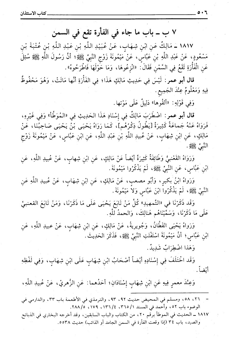 1817 - مالك عن بن شِهَابٍ عَنْ عُبَيْدِ اللَّهِ بْنِ عَبْدِ اللَّهِ بْنِ عُتْبَةَ بْنِ مَسْعُودٍ عَنْ عَبْدِ اللَّهِ بْنِ عَبَّاسٍ عَنْ مَيْمُونَةَ زَوْجِ النَّبِيِّ صَلَّى اللَّهُ عَلَيْهِ وَسَلَّمَ أَنَّ رَسُولَ اللَّهِ صَلَّى اللَّهُ عَلَيْهِ وَسَلَّمَ سُئِلَ عَنِ الْفَأْرَةِ تَقَعُ فِي السَّمْنِ فَقَالَ انْزِعُوهَا وَمَا حَوْلَهَا فَاطْرَحُوهُ