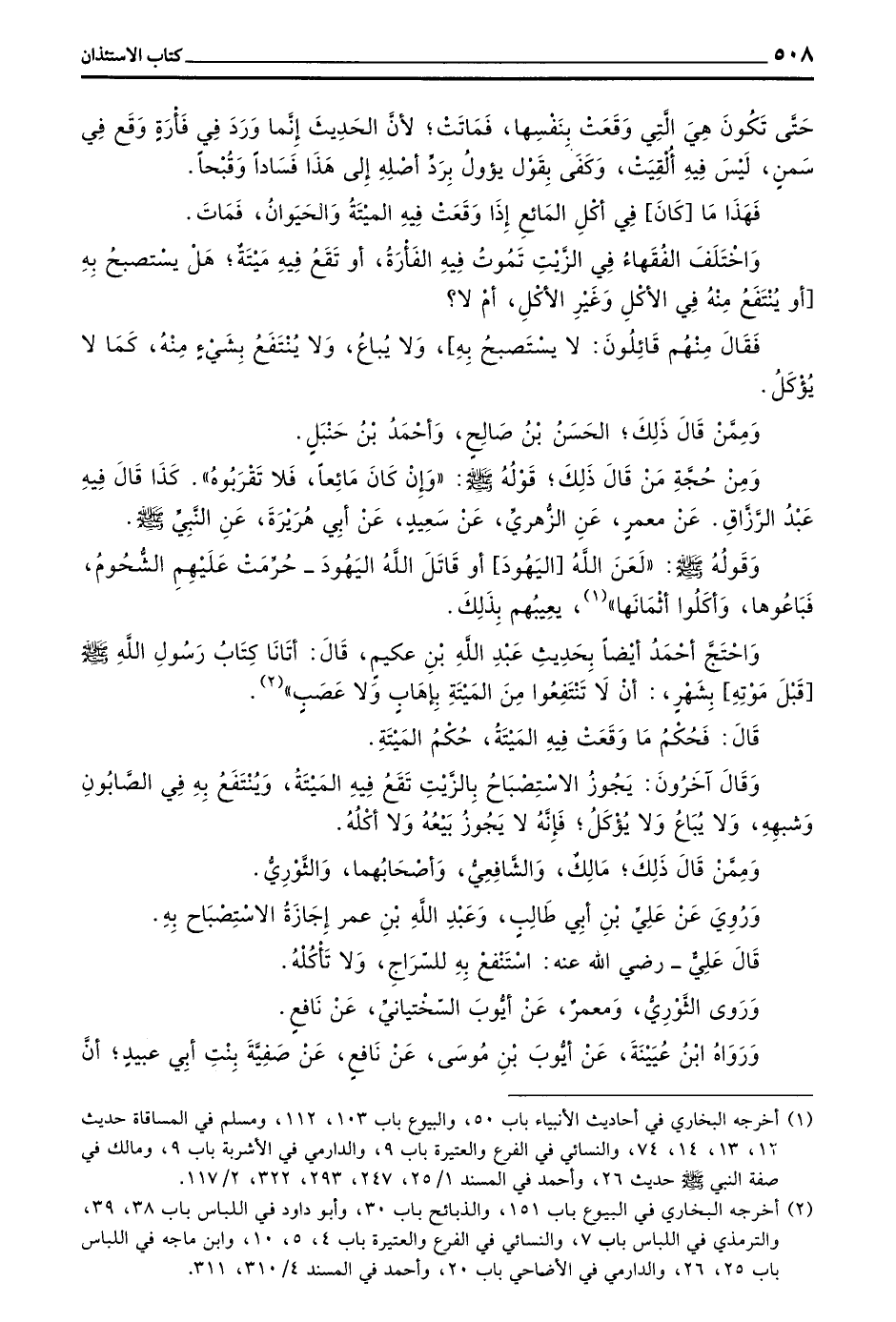 وَاخْتَلَفَ الْفُقَهَاءُ فِي الزَّيْتِ تَمُوتُ فِيهِ الْفَأْرَةُ أَوْ تَقَعُ فِيهِ مَيْتَةٌ هَلْ يُسْتَصْبَحُ بِهِ أَوْ يُنْتَفَعُ مِنْهُ فِي الْأَكْلِ وَغَيْرِ الْأَكْلِ أَمْ لَا