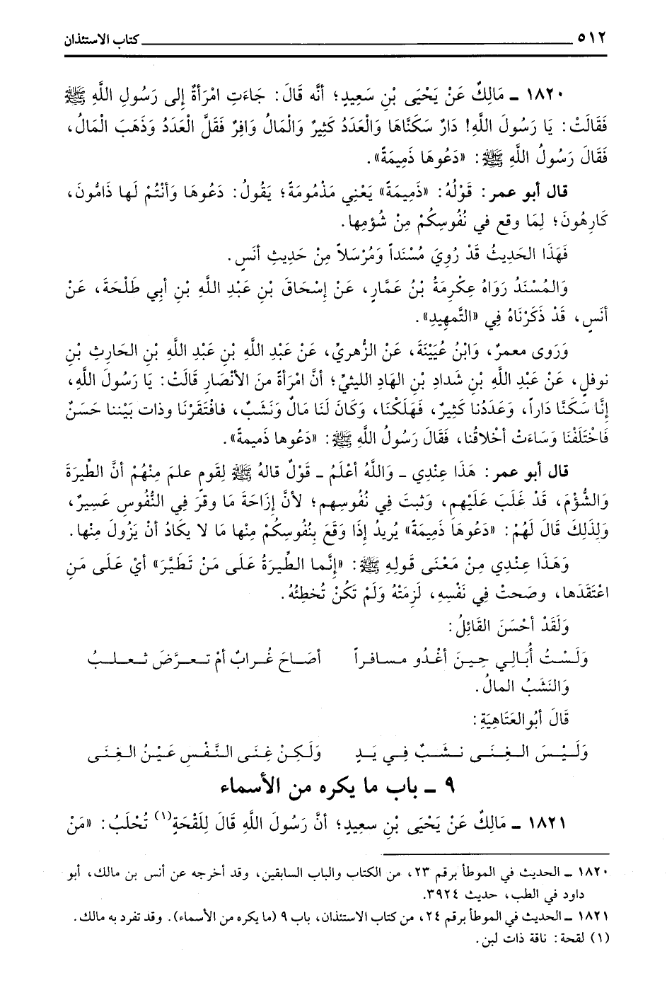 1820 - مَالِكٌ عَنْ يَحْيَى بْنِ سَعِيدٍ أَنَّهُ قَالَ جَاءَتِ امْرَأَةٌ إِلَى رَسُولِ اللَّهِ صَلَّى اللَّهُ عَلَيْهِ وَسَلَّمَ فَقَالَتْ يَا رَسُولَ اللَّهِ! دَارٌ سَكَنَّاهَا وَالْعَدَدُ كَثِيرٌ وَالْمَالُ وَافِرٌ فَقَلَّ الْعَدَدُ وَذَهَبَ الْمَالُ فَقَالَ رَسُولُ اللَّهِ صَلَّى اللَّهُ عَلَيْهِ وَسَلَّمَ دَعُوهَا ذَمِيمَةً