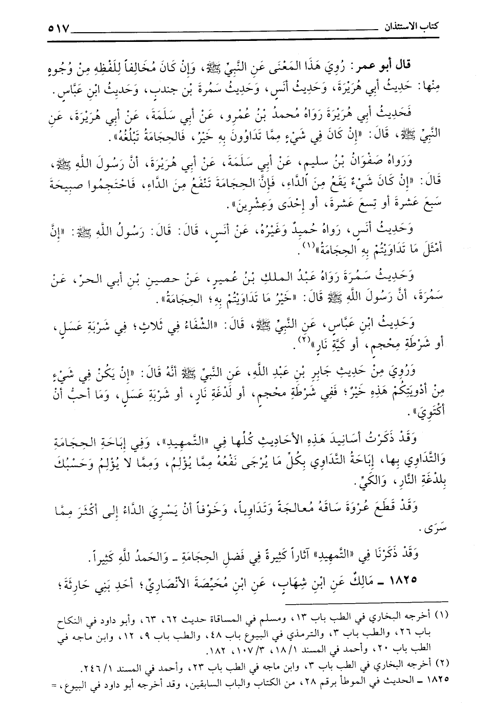 وقد ذكرت أسانيد هذه الأحاديث كلها في التَّمْهِيدِ وَفِي إِبَاحَةِ الْحِجَامَةِ وَالتَّدَاوِي بِهَا إِبَاحَةُ التَّدَاوِي بِكُلِّ مَا يُرْجَى نَفْعُهُ مِمَّا يُؤْلِمُ وَمِمَّا لَا يُؤْلِمُ وَحَسْبُكَ بِلَدْغَةِ النَّارِ وَالْكَيِّ
