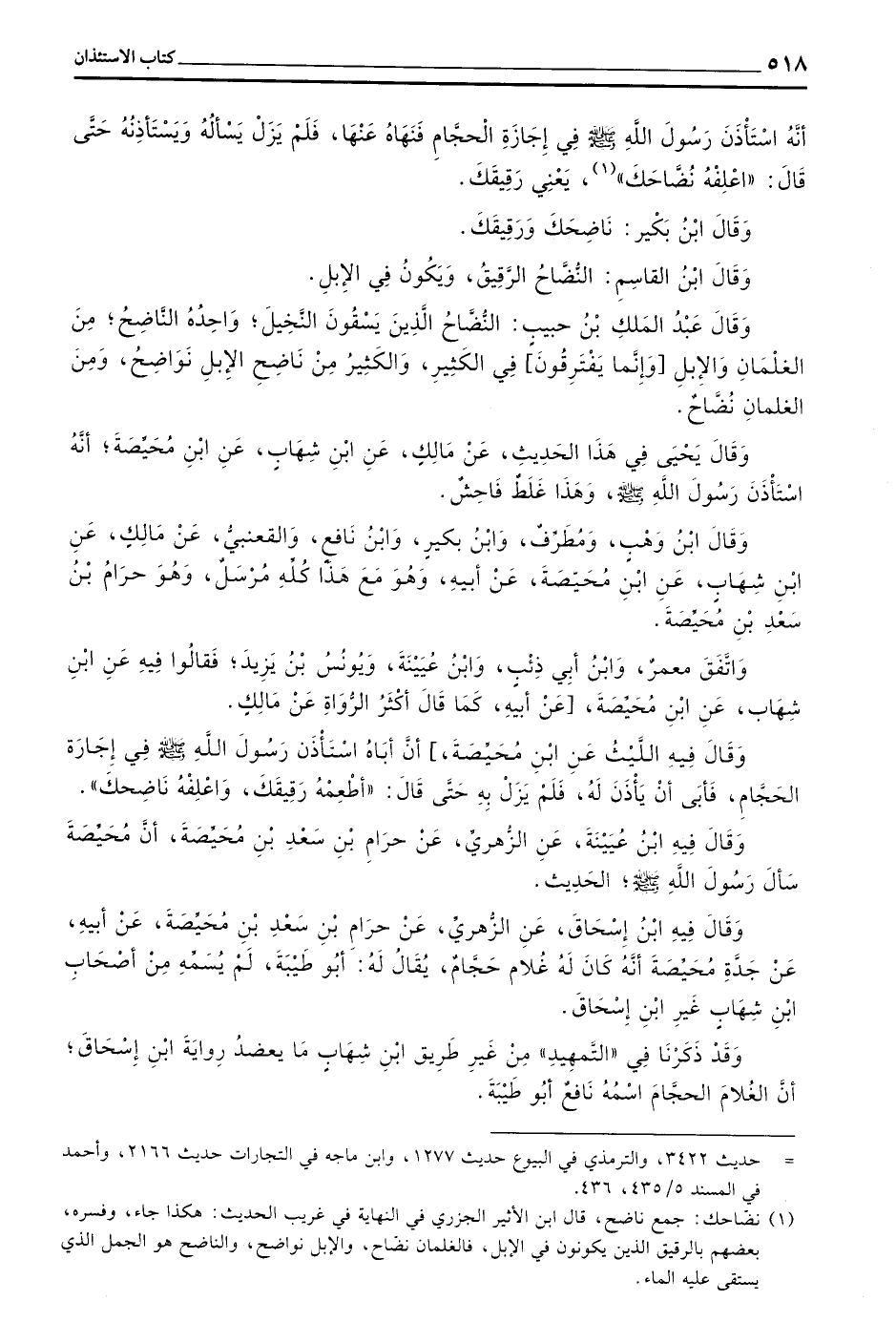 أَنَّهُ اسْتَأْذَنَ رَسُولَ اللَّهِ صَلَّى اللَّهُ عَلَيْهِ وسلم في إجازة الْحَجَّامِ فَنَهَاهُ عَنْهَا فَلَمْ يَزَلْ يَسْأَلُهُ وَيَسْتَأْذِنُهُ حَتَّى قَالَ اعْلِفْهُ نُضَّاحَكَ يَعْنِي رَقِيقَكَ