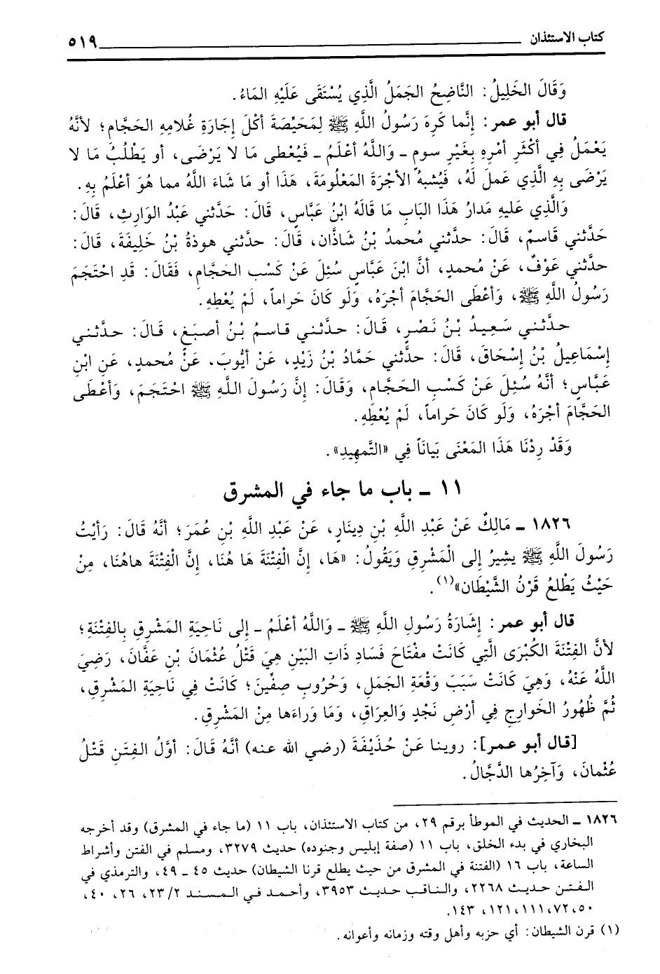 1826 - مَالِكٌ عَنْ عَبْدِ اللَّهِ بْنِ دِينَارٍ عَنْ عَبْدِ اللَّهِ بْنِ عُمَرَ أَنَّهُ قَالَ رَأَيْتُ رَسُولَ اللَّهِ صَلَّى اللَّهُ عَلَيْهِ وَسَلَّمَ يُشِيرُ إِلَى الْمَشْرِقِ وَيَقُولُ هَا إن الفتنة ها هنا إن الفتنة ها هنا مِنْ حَيْثُ يَطْلُعُ قَرْنُ الشَّيْطَانِ
