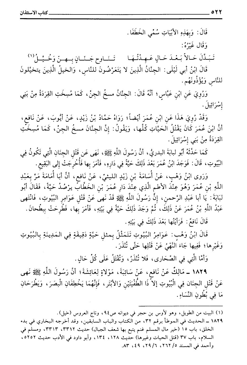 كَمَا حَدَّثَهُ أَبُو لُبَابَةَ الْبَدْرِيُّ أن رسول الله صلى الله عليه وسلم نَهَى عَنْ قَتْلِ الْجِنَّانِ الَّتِي تَكُونُ فِي البيوت قال فوجد بن عُمَرَ بَعْدَ ذَلِكَ حَيَّةً فِي دَارِهِ فَأَمَرَ بها فأخرجت إلى البقيع