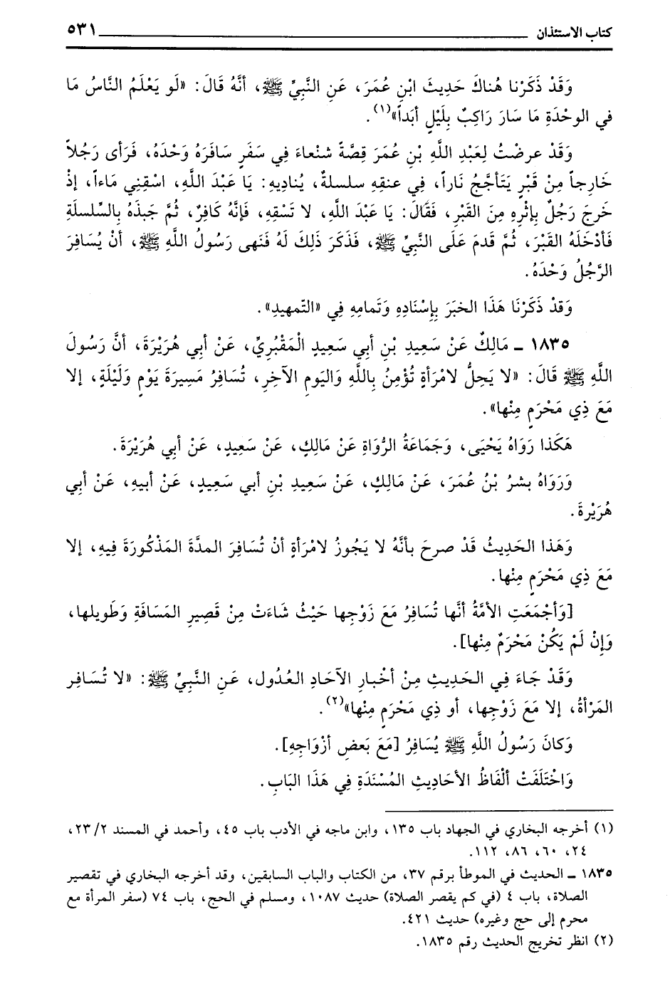 وَقَدْ جَاءَ فِي الْحَدِيثِ مِنْ أَخْبَارِ الْآحَادِ الْعُدُولُ عَنِ النَّبِيِّ صَلَّى اللَّهُ عَلَيْهِ وَسَلَّمَ لَا تُسَافِرِ الْمَرْأَةُ إِلَّا مَعَ زَوْجِهَا أَوْ ذِي مَحْرَمٍ مِنْهَا