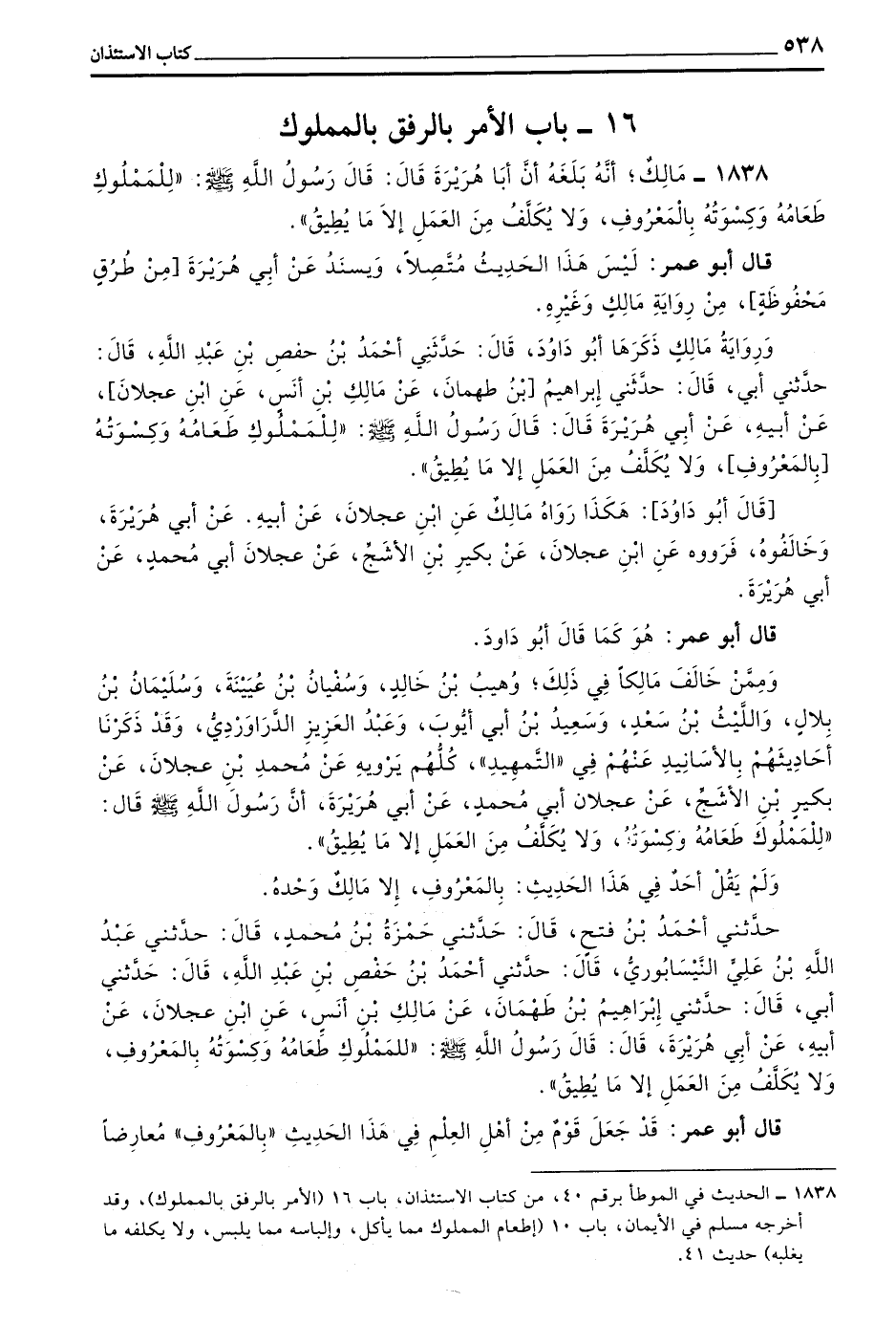 1838 - مَالِكٌ أَنَّهُ بَلَغَهُ أَنَّ أَبَا هُرَيْرَةَ قَالَ قَالَ رَسُولُ اللَّهِ صَلَّى اللَّهُ عَلَيْهِ وَسَلَّمَ لِلْمَمْلُوكِ طَعَامُهُ وَكِسْوَتُهُ بِالْمَعْرُوفِ وَلَا يُكَلَّفُ مِنَ الْعَمَلِ إِلَّا مَا يُطِيقُ