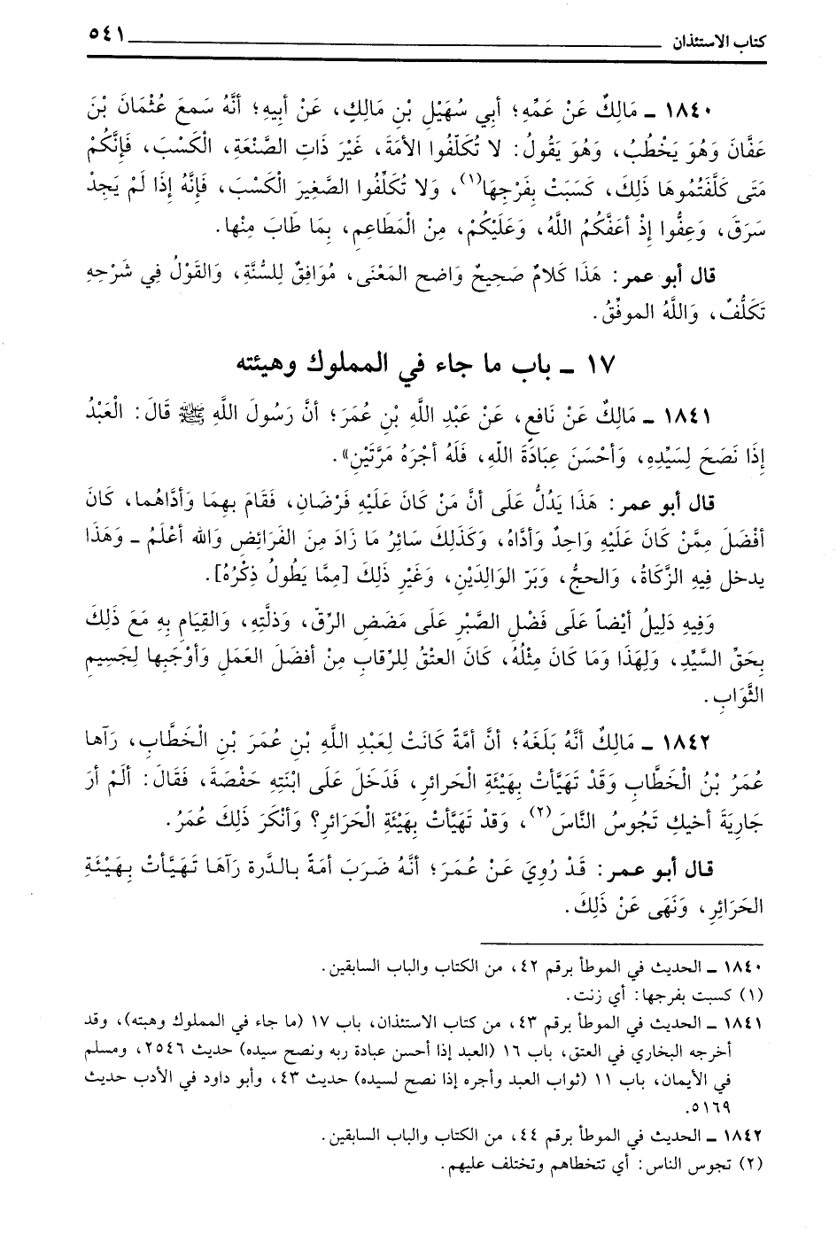 1840 - مَالِكٌ عَنْ عَمِّهِ أَبِي سُهَيْلِ بْنِ مَالِكٍ عَنْ أَبِيهِ أَنَّهُ سَمِعَ عُثْمَانَ بْنَ عَفَّانَ وَهُوَ يَخْطُبُ وَهُوَ يَقُولُ لَا تُكَلِّفُوا الْأَمَةَ غَيْرَ ذَاتِ الصَّنْعَةِ الْكَسْبَ فَإِنَّكُمْ مَتَى كَلَّفْتُمُوهَا ذَلِكَ كَسَبَتْ بِفَرْجِهَا وَلَا تُكَلِّفُوا الصَّغِيرَ الْكَسْبَ فَإِنَّهُ إِذَا لَمْ يَجِدْ سَرَقَ وَعِفُّوا إِذْ أَعَفَّكُمُ اللَّهُ وَعَلَيْكُمْ مِنَ الْمَطَاعِمِ بِمَا طَابَ مِنْهَا