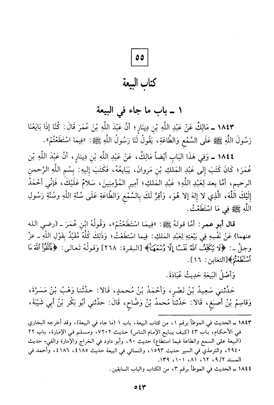 1843 - مَالِكٌ عَنْ عَبْدِ اللَّهِ بْنِ دِينَارٍ أَنَّ عَبْدَ اللَّهِ بْنَ عُمَرَ قَالَ كُنَّا إِذَا بَايَعْنَا رَسُولَ اللَّهِ صَلَّى اللَّهُ عَلَيْهِ وَسَلَّمَ عَلَى السَّمْعِ وَالطَّاعَةِ يَقُولُ لَنَا رَسُولُ اللَّهِ صَلَّى اللَّهُ عَلَيْهِ وَسَلَّمَ فِيمَا اسْتَطَعْتُمْ