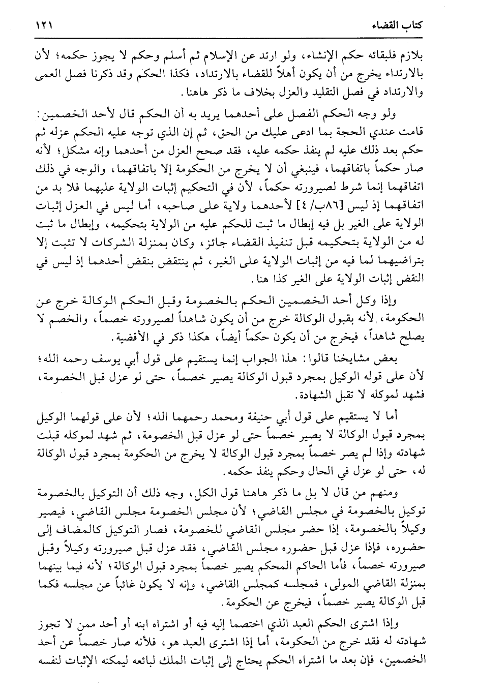 ولو وجه الحكم الفصل على أحدهما يريد به أن الحكم قال لأحد الخصمين: قامت عندي الحجة بما ادعي عليك من الحق، ثم إن الذي توجه عليه الحكم عزله ثم حكم بعد ذلك عليه لم ينفذ حكمه عليه، فقد صحح العزل من أحدهما وإنه مشكل؛ لأنه صارحكماً بإتفاقهما، فينبغي أن لا يخرج من الحكومة إلا باتفاقهما، والوجه في ذلك اتفاقهما إنما شرط لصيرورته حكماً، لأن في التحكيم إثبات الولاية عليهما فلا بد من اتفاقهما إذ ليس (86ب4) لأحدهما ولاية على صاحبه، أما ليس في العزل إثبات الولاية على الغير بل فيه إبطال ما ثبت للحكم عليه من الولاية بتحكيمه، وإبطال ما ثبت له من الولاية بتحكيمه قبل تنفيذ القضاء جائز، وكان بمنزلة الشركات لا تثبت إلا بتراضيهما لما فيه من إثبات الولاية على الغير، ثم ينتقض بنقض أحدهما إذ ليس في النقض إثبات الولاية على الغير كذا هنا.