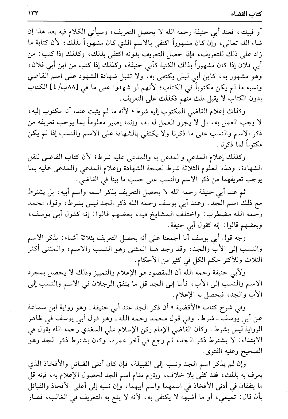 وفي شرح كتاب «الأقضية» أن ذكر الجد عند أبي حنيفة * وهو رواية ابن سماعة عن أبي يوسف * شرط، وفي قول محمد رحمه الله * وهو قول أبي يوسف في ظاهر الرواية ليس بشرط. وكان القاضي الإمام ركن الإسلام علي السغدي رحمه الله يقول في الابتداء: لا يشترط ذكر الجد، ثم رجع في آخر عمره، وكان يشترط ذكر الجد وهو الصحيح وعليه الفتوى.