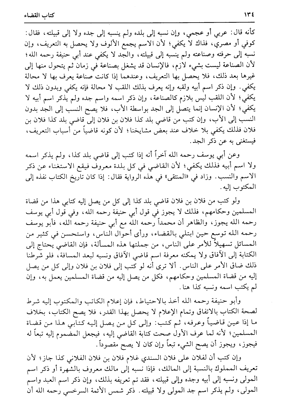 كأنه قال: عربي أو عجمي، وإن نسبه إلى بلده ولم ينسبه إلى جده ولا إلى قبيلته، فقال: كوفي أو مصري، فذاك لا يكفي؛ لأن الاسم يجمع الألوف ولا يحصل به التعريف، وإن نسبه إلى حرفته وصناعته ولم ينسبه إلى قبيلته، والجد لا يكفي عند أبي حنيفة رحمه الله؛ لأن الصناعة ليست بشيء لازم، فالإنسان قد يشغل بصناعة في زمان ثم يتحول منها إلى غيرها بعد ذلك، فلا يحصل بها التعريف، وعندهما إذا كانت صناعة يعرف بها لا محالة يكفي. وإن ذكر اسم أبيه ولقبه وإنه يعرف بذلك اللقب لا محالة فإنه يكفي وبدون ذلك لا يكفي؛ لأن اللقب ليس بلازم كالصناعة، وإن ذكر اسمه واسم جده ولم يذكر اسم أبيه لا يكفي؛ لأن الإنسان إنما يتصل إلى الجد بواسطة الأب، فلا يصح النسب إلى الجد بدون النسب إلى الأب، وإن كتب من قاضي بلد كذا فلان بن فلان إلى قاضي بلد كذا فلان بن فلان فذلك يكفي بلا خلاف عند بعض مشايخنا؛ لأن كونه قاضياً من أسباب التعريف، فيستغنى به عن ذكر الجد.