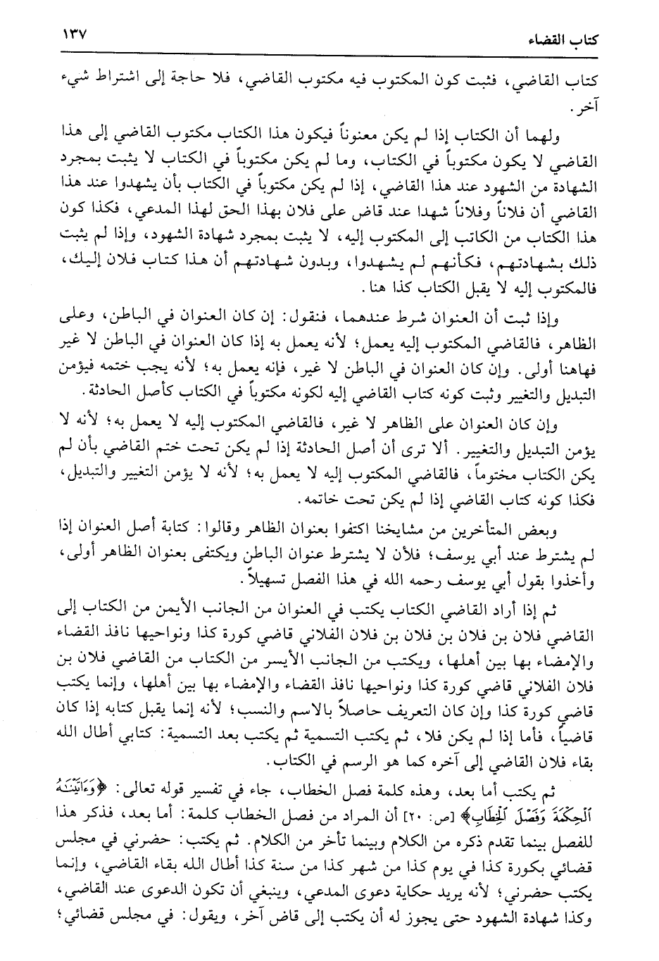ثم إذا أراد القاضي الكتاب يكتب في العنوان من الجانب الأيمن من الكتاب إلى القاضي فلان بن فلان بن فلان بن فلان الفلاني قاضي كورة كذا ونواحيها نافذ القضاء والإمضاء بها بين أهلها، ويكتب من الجانب الأيسر من الكتاب من القاضي فلان بن فلان الفلاني قاضي كورة كذا ونواحيها نافذ القضاء والإمضاء بها بين أهلها، وإنما يكتب قاضي كورة كذا وإن كان التعريف حاصلاً بالاسم والنسب؛ لأنه إنما يقبل كتابه إذا كان قاضياً، فأما إذا لم يكن فلا، ثم يكتب التسمية ثم يكتب بعد التسمية: كتابي أطال الله بقاء فلان القاضي إلى آخره كما هو الرسم في الكتاب.