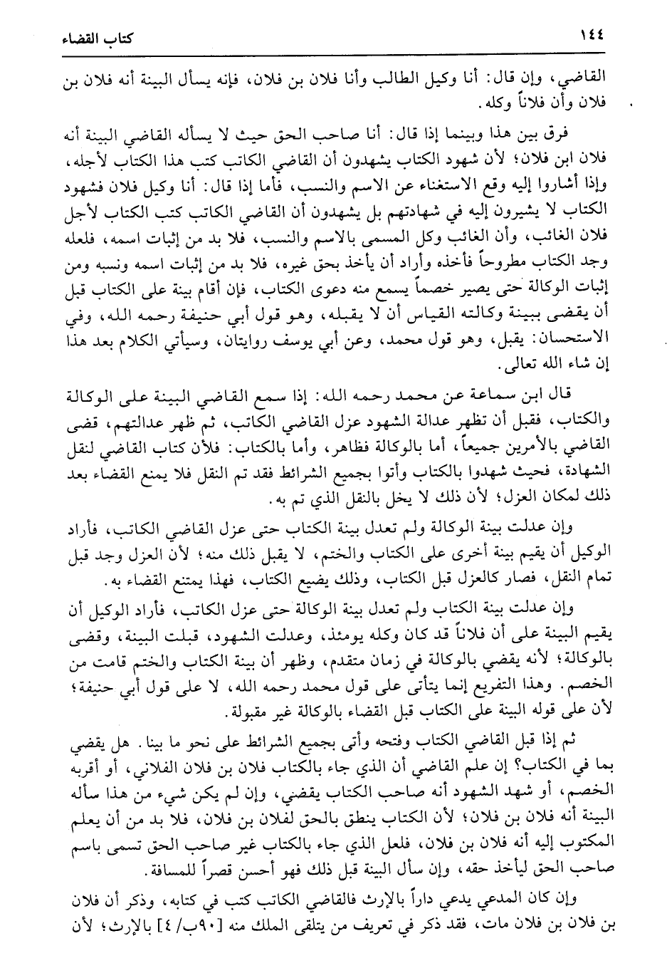 ثم إذا قبل القاضي الكتاب وفتحه وأتى بجميع الشرائط على نحو ما بينا. هل يقضي بما في الكتاب؟ إن علم القاضي أن الذي جاء بالكتاب فلان بن فلان الفلاني، أو أقربه الخصم، أو شهد الشهود أنه صاحب الكتاب يقضي، وإن لم يكن شيء من هذا سأله البينة أنه فلان بن فلان؛ لأن الكتاب ينطق بالحق لفلان بن فلان، فلا بد من أن يعلم المكتوب إليه أنه فلان بن فلان، فلعل الذي جاء بالكتاب غير صاحب الحق تسمى باسم صاحب الحق ليأخذ حقه، وإن سأل البينة قبل ذلك فهو أحسن قصراً للمسافة.
