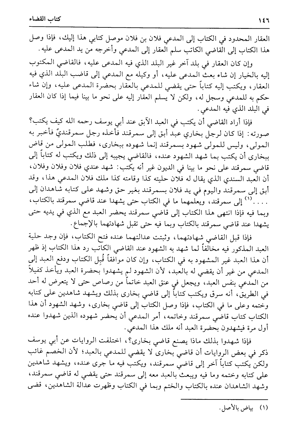 فإذا شهدوا بذلك ماذا يصنع قاضي بخارى؟، اختلفت الروايات عن أبي يوسف ذكر في بعض الروايات أن قاضي بخارى لا يقضي للمدعي بالعبد؛ لأن الخصم غائب ولكن يكتب كتاباً آخر إلى قاضي سمرقند، ويكتب فيه ما جرى عنده، ويشهد شاهدين على كتابه وختمه وما فيه ويبعث بالعبد معه إلى سمرقند حتى يقضي له قاضي سمرقند، وشهد الشاهدان عنده بالكتاب والختم وبما في الكتاب وظهرت عدالة الشاهدين، قضى
